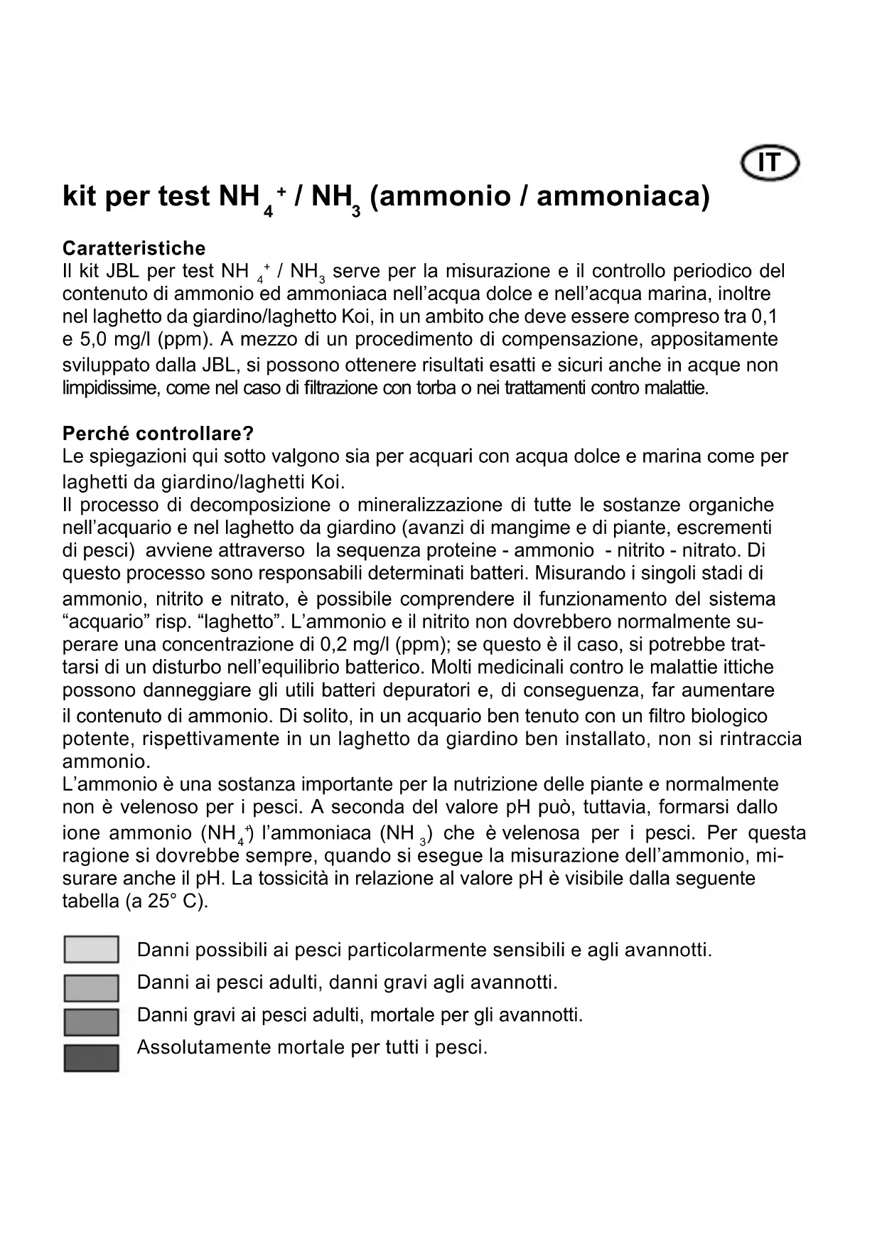 serve per la misurazione e il controllo periodico del contenuto di ammonio ed ammoniaca nell’acqua dolce e nell’acqua marina, inoltre nel laghetto da giardino/laghetto Koi, in un ambito che deve essere compreso tra 0,1 e 5,0 mg/l (ppm). A mezzo di un procedimento di compensazione, appositamente sviluppato dalla JBL, si possono ottenere risultati esatti e sicuri anche in acque non limpidissime, come nel caso di ltrazione con torba o nei trattamenti contro malattie. Perché controllare? Le spiegazioni qui sotto valgono sia per acquari con acqua dolce e marina come per laghetti da giardino/laghetti Koi. Il processo di decomposizione o mineralizzazione di tutte le sostanze organiche nell’acquario e nel laghetto da giardino (avanzi di mangime e di piante, escrementi di pesci) avviene attraverso la sequenza proteine - ammonio - nitrito - nitrato. Di questo processo sono responsabili determinati batteri. Misurando i singoli stadi di ammonio, nitrito e nitrato, è possibile comprendere il funzionamento del sistema “acquario” risp. “laghetto”. L’ammonio e il nitrito non dovrebbero normalmente su- perare una concentrazione di 0,2 mg/l (ppm); se questo è il caso, si potrebbe trat- tarsi di un disturbo nell’equilibrio batterico. Molti medicinali contro le malattie ittiche possono danneggiare gli utili batteri depuratori e, di conseguenza, far aumentare il contenuto di ammonio. Di solito, in un acquario ben tenuto con un ltro biologico potente, rispettivamente in un laghetto da giardino ben installato, non si rintraccia ammonio. L’ammonio è una sostanza importante per la nutrizione delle piante e normalmente non è velenoso per i pesci. A seconda del valore pH può, tuttavia, formarsi dallo ione ammonio (NH