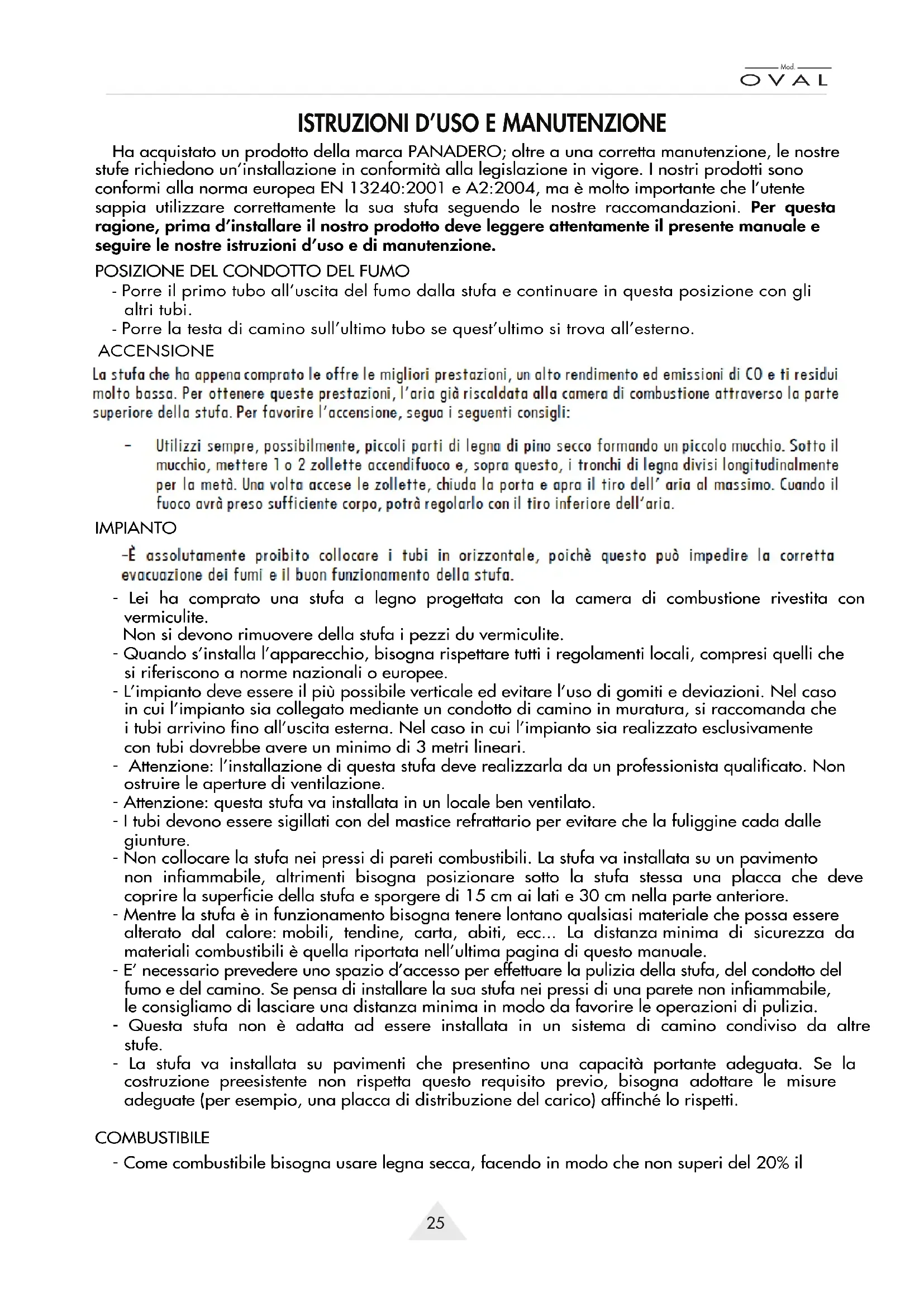 Mod. O V A L Ha acquistato un prodotto della marca PANADERO; oltre a una corretta manutenzione, le nostre stufe richiedono un’installazione in conformità alla legislazione in vigore. I nostri prodotti sono conformi alla norma europea EN 13240:2001 e A2:2004, ma è molto importante che l’utente sappia utilizzare correttamente la sua stufa seguendo le nostre raccomandazioni. Per questa ragione, prima d’installare il nostro prodotto deve leggere attentamente il presente manuale e seguire le nostre istruzioni d’uso e di manutenzione.