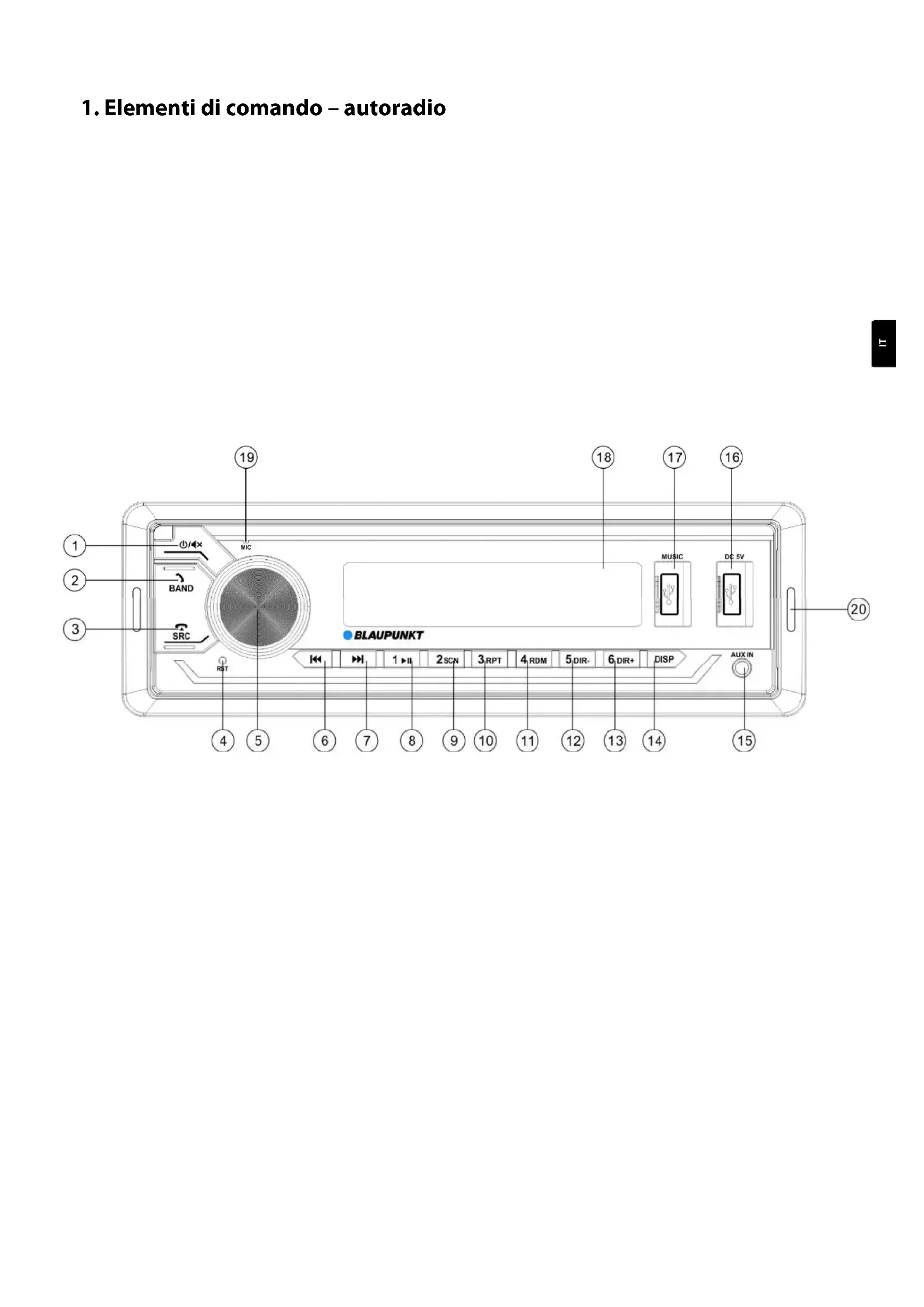 Pressione breve: Accensione dell’autoradio, silenziamento dell’autoradio Pressione lunga: Spegnimento dell’autoradio ② BAND/Ricezione delle chiamate Modifica del livello di memoria, ricezione di una chiamata in arrivo, composizione dell'ultimo numero ③ Pulsante SRC/Rifiuto della chiamata, chiusura della chiamata: Selezione della sorgente audio, le sorgenti audio disponibili vengono commutate una per una. Durante la chiamata: Rifiuto della chiamata, chiusura della chiamata ④ Pulsante RST: Reset: Reset delle impostazioni del dispositivo ⑤ Manopola: Rotazione: Volume alto/basso Nel menu, permette di passare tra le opzioni di impostazione/modifica delle opzioni Pressione breve: Richiamo delle impostazioni audio (vedere il capitolo IMPOSTAZIONI | MENU) Pressione lunga: Richiamo delle impostazioni avanzate (vedere il capitolo IMPOSTAZIONI | MENU) ⑥ ⑦ Pulsanti avanti/indietro: Pressione breve: A seconda della sorgente, ricerca FM, cambio del servizio DAB (solo BPA 1124 DAB BT), cambio della traccia USB/Bluetooth, ecc. Pressione lunga: A seconda della sorgente: FM: Ricerca manuale DAB: Ricerca della banda (solo BPA 1124 DAB BT) USB: Scorrimento veloce avanti/indietro ⑧-⑬ Pulsanti delle stazioni radio: Pressione breve: Richiamo di una stazione o di una seconda funzione/funzione speciale visualizzata a seconda della sorgente selezionata (riproduzione/pausa, funzione di riproduzione SCN, funzione di ripetizione RPT, riproduzione casuale RDM) Pressione lunga: Memorizzazione della stazione radio attuale ⑫-⑬ Pulsanti DIR-/ DIR+: Pressione breve: Cambio del catalogo durante la riproduzione da USB Pressione lunga: 10 titoli avanti/indietro per la riproduzione da USB ⑭ Pulsante DISP: Pressione breve: Commutazione del display tra diverse informazioni a seconda della sorgente selezionata Pressione lunga: Impostazione dell’ora ⑮ Ingresso AUX-IN: Connettore per sorgente audio analogica esterna con spina jack stereo da 3,5 mm ⑯ Connettore USB da 5 V CC: Connettore per la ricarica di dispositivi quali i telefoni cellulari (max. 2A) ⑰ Connettore USB MUSIC: Connettore per chiavetta USB per la riproduzione di musica (FAT/exFAT) ⑱ Display LC: Visualizzazione di informazioni come stazione, brano, ora e opzioni delle impostazioni ⑲ MIC Microfono: (Microfono vivavoce) ⑳ Fori per lo strumento di rimozioneIT