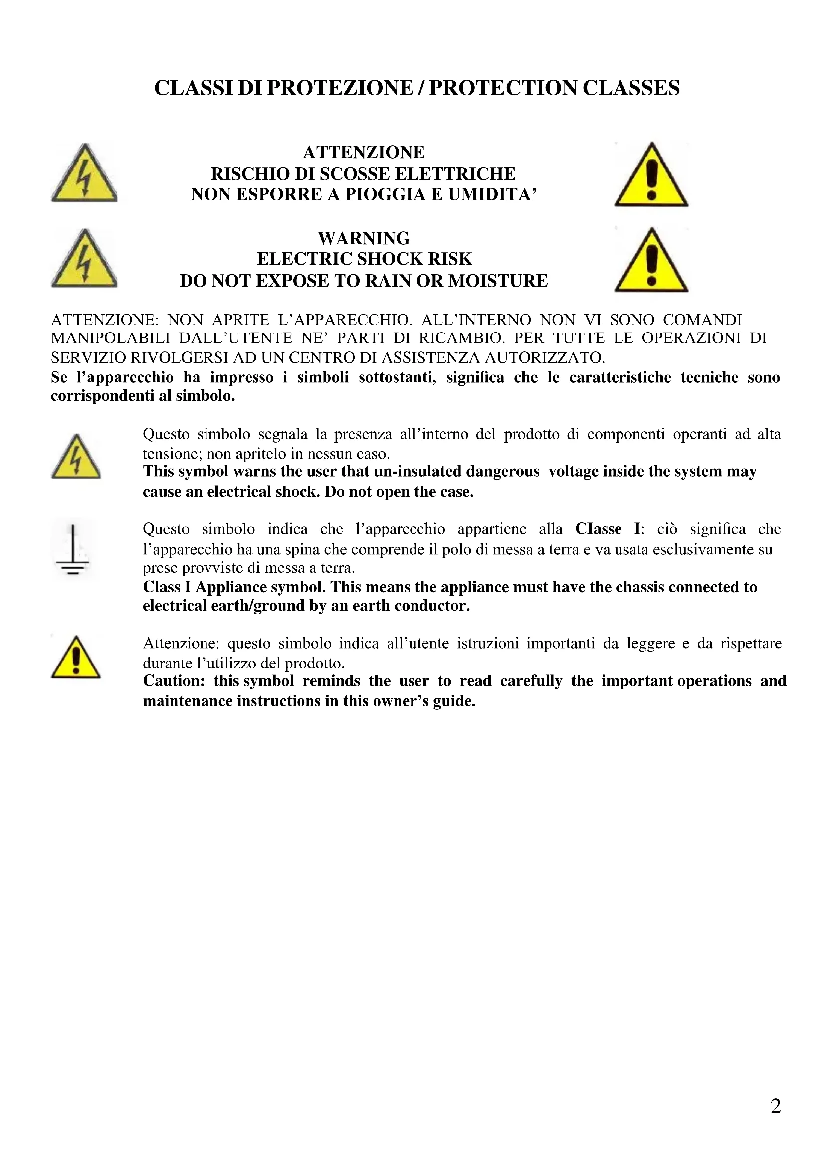 DO NOT EXPOSE TO RAIN OR MOISTURE ATTENZIONE: NON APRITE L’APPARECCHIO. ALL’INTERNO NON VI SONO COMANDI MANIPOLABILI DALL’UTENTE NE’ PARTI DI RICAMBIO. PER TUTTE LE OPERAZIONI DI SERVIZIO RIVOLGERSI AD UN CENTRO DI ASSISTENZA AUTORIZZATO. Se l’apparecchio ha impresso i simboli sottostanti, significa che le caratteristiche tecniche sono corrispondenti al simbolo. Questo simbolo segnala la presenza all’interno del prodotto di componenti operanti ad alta tensione; non apritelo in nessun caso. This symbol warns the user that un-insulated dangerous voltage inside the system may cause an electrical shock. Do not open the case. Questo simbolo indica che l’apparecchio appartiene alla CIasse I: ciò significa che l’apparecchio ha una spina che comprende il polo di messa a terra e va usata esclusivamente su prese provviste di messa a terra. Class I Appliance symbol. This means the appliance must have the chassis connected to electrical earth/ground by an earth conductor. Attenzione: questo simbolo indica all’utente istruzioni importanti da leggere e da rispettare durante l’utilizzo del prodotto. Caution: this symbol reminds the user to read carefully the important operations and maintenance instructions in this owner’s guide.3
