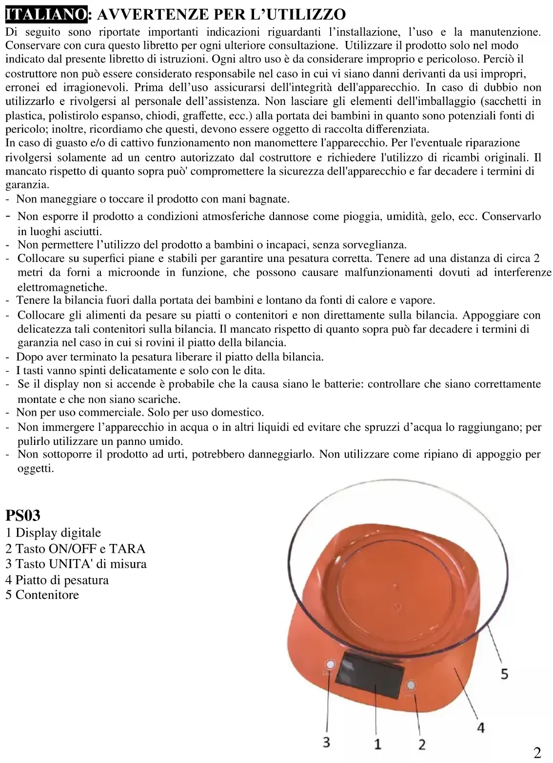 PS03 1 Display digitale 2 Tasto ON/OFF e TARA 3 Tasto UNITA' di misura 4 Piatto di pesatura 5 Contenitore3 INSERIMENTO BATTERIE Sotto la bilancia è presente il vano di alloggio delle batterie. Il funzionamento della bilancia richiede la presenza di 2 batterie AAA, 1.5V ministilo. - Aprire lo sportello tirando la linguetta di bloccaggio. Estrarre le eventuali batterie scariche. - Nel vano di alloggio la sagomatura ed i simboli (+ -) indicano il verso di inserimento delle pile che rispetta la corretta polarità di alimentazione. - Inserire le due pile seguendo tali indicazioni e i simboli sulle batterie stesse e richiudere il coperchio. AVVERTENZE BATTERIE - Utilizzare sempre batterie tipo AAA, 1.5V ministilo. - Fare attenzione ad inserire le pile secondo la corretta polarità poiché altrimenti queste possono perdere liquido e danneggiare la bilancia. Tali danni non sono coperti da garanzia. - Quando non si utilizza l’apparecchio per tanto tempo si consiglia di togliere le batterie per evitare che si esauriscano. Non scaldare, aprire o gettare nel fuoco le batterie. - Esse sono oggetto di raccolta differenziata. Gettarle negli appositi contenitori. FUNZIONAMENTO Premere il tasto TARA (2) ogni volta che si vuole azzerare il valore visualizzato a display. Questo è necessario quando sul display vengono letti valori diversi da zero pur non essendoci nulla sul piatto o quando si vuole effettuare l’operazione di tara. Attendere un secondo dopo aver premuto TARA. Pesatura normale Per pesare alimenti solidi come pane, frutta, verdura, etc… è sufficiente accendere la bilancia con il tasto “ON/OFF” (2) e posare direttamente gli alimenti sul piatto di pesatura. Pesatura con tara Per pesare alimenti liquidi, granaglie, marmellata, farina, etc…è necessario utilizzare un contenitore. Per effettuare la pesatura del solo contenuto seguire questi passi: Accendere la bilancia con il tasto “ON/OFF” (2). Posizionare il contenitore vuoto sul piatto di pesatura e premere il tasto “TARA” (2) per azzerare il valore sul display e mettere come tara il peso del contenitore. Riempire il contenitore con gli alimenti da pesare. N.B.: se si accende la bilancia dopo aver posizionato il contenitore sul piatto di pesatura non è necessario effettuare la taratura. Unità di misura - Con il tasto unità di misura (3), è possibile cambiare da grammi (g) a once (oz) a kilogrammi (kg) e libbre (lb). Superamento carico massimo La bilancia può pesare alimenti fino a 5 Kg. Se si superano i 5kg sul display appare “EEEE”. Con carichi pesanti la bilancia rischia di rompersi. Attenzione a rispettare il limite massimo di 5 Kg. Indicazione di batteria scarica Quando le batterie sono esaurite appare “Lo” e la bilancia si spegne automaticamente. Sostituire le batterie con altre nuove seguendo il paragrafo “Inserimento batterie”. SPEGNIMENTO Automatico: la bilancia si spegne se viene lasciata ferma (con o senza carico) per 120 secondi. Manuale: la bilancia può essere spenta dall’utente spingendo il tasto “ON/OFF” (2). PULIZIA Pulire solo con panni umidi e morbidi e detergenti non abrasivi per evitare di rovinare l’estetica del prodotto. CARATTERISTICHE TECNICHE