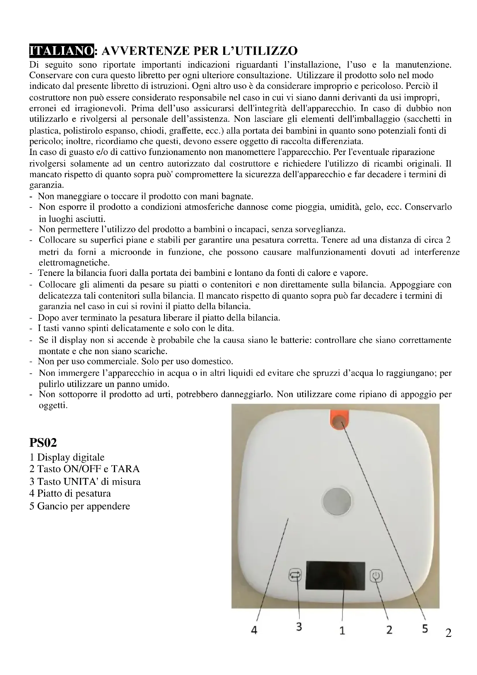 PS02 1 Display digitale 2 Tasto ON/OFF e TARA 3 Tasto UNITA' di misura 4 Piatto di pesatura 5 Gancio per appendere3 INSERIMENTO BATTERIE Sotto la bilancia è presente il vano di alloggio delle batterie. Il funzionamento della bilancia richiede la presenza di 2 batterie CR2032 al litio. - Aprire lo sportello tirando la linguetta di bloccaggio. Estrarre l’eventuale batteria scarica tirando delicatamente la linguetta di metallo presente sul bordo dell’alloggio della batteria. - Inserire la batteria con il segno + (riportato sulla batteria stessa) rivolto verso l’alto e quindi visibile. - Per l’inserimento spingere la batteria nel suo alloggio fino a bloccarla. - Richiudere il coperchio. AVVERTENZE BATTERIE - Utilizzare sempre batterie tipo CR2032 al litio. - Fare attenzione ad inserire le pile secondo la corretta polarità poiché altrimenti queste possono perdere liquido e danneggiare la bilancia. Tali danni non sono coperti da garanzia. - Quando non si utilizza l’apparecchio per tanto tempo si consiglia di togliere le batterie per evitare che si esauriscano. Non scaldare, aprire o gettare nel fuoco le batterie. - Esse sono oggetto di raccolta differenziata. Gettarle negli appositi contenitori. FUNZIONAMENTO Premere il tasto TARA (2) ogni volta che si vuole azzerare il valore visualizzato a display. Questo è necessario quando sul display vengono letti valori diversi da zero pur non essendoci nulla sul piatto o quando si vuole effettuare l’operazione di tara. Attendere un secondo dopo aver premuto TARA. Pesatura normale Per pesare alimenti solidi come pane, frutta, verdura, etc… è sufficiente accendere la bilancia con il tasto “ON/OFF” (2) e posare direttamente gli alimenti sul piatto di pesatura. Pesatura con tara Per pesare alimenti liquidi, granaglie, marmellata, farina, etc…è necessario utilizzare un contenitore. Per effettuare la pesatura del solo contenuto seguire questi passi: Accendere la bilancia con il tasto “ON/OFF” (2). Posizionare il contenitore vuoto sul piatto di pesatura e premere il tasto “TARA” (2) per azzerare il valore sul display e mettere come tara il peso del contenitore. Riempire il contenitore con gli alimenti da pesare. N.B.: se si accende la bilancia dopo aver posizionato il contenitore sul piatto di pesatura non è necessario effettuare la taratura. Unità di misura - Con il tasto unità di misura (3), è possibile cambiare da grammi (g) a once (oz) a kilogrammi (kg) e libbre (lb). Superamento carico massimo La bilancia può pesare alimenti fino a 5 Kg. Se si superano i 5kg sul display appare “EEEE”. Con carichi pesanti la bilancia rischia di rompersi. Attenzione a rispettare il limite massimo di 5 Kg. Indicazione di batteria scarica Quando le batterie sono esaurite appare “Lo” e la bilancia si spegne automaticamente. Sostituire le batterie con altre nuove seguendo il paragrafo “Inserimento batterie”. SPEGNIMENTO Automatico: la bilancia si spegne se viene lasciata ferma (con o senza carico) per 120 secondi. Manuale: la bilancia può essere spenta dall’utente spingendo il tasto “ON/OFF” (2). PULIZIA Pulire solo con panni umidi e morbidi e detergenti non abrasivi per evitare di rovinare l’estetica del prodotto. CARATTERISTICHE TECNICHE