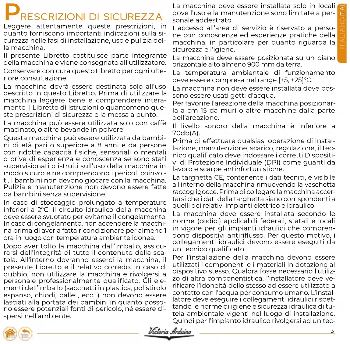 Leggere attentamente queste prescrizioni, in quanto forniscono importanti indicazioni sulla si- curezza nelle fasi di installazione, uso e pulizia del- la macchina. Il presente Libretto costituisce parte integrante della macchina e viene consegnato all’utilizzatore. Conservare con cura questo Libretto per ogni ulte- riore consultazione. La macchina dovrà essere destinata solo all’uso descritto in questo Libretto. Prima di utilizzare la macchina leggere bene e comprendere intera- mente il Libretto di Istruzioni o quantomeno que- ste prescrizioni di sicurezza e la messa a punto. La macchina può essere utilizzata solo con caffè macinato, o altre bevande in polvere. Questa macchina può essere utilizzata da bambi- ni di età pari o superiore a 8 anni e da persone con ridotte capacità fisiche, sensoriali o mentali o prive di esperienza e conoscenza se sono stati supervisionati o istruiti sull’uso della macchina in modo sicuro e ne comprendono i pericoli coinvol- ti. I bambini non devono giocare con la macchina. Pulizia e manutenzione non devono essere fatte da bambini senza supervisione. In caso di stoccaggio prolungato a temperature inferiori a 2°C, il circuito idraulico della macchina deve essere svuotato per evitarne il congelamento. In caso di congelamento, non accendere la macchi