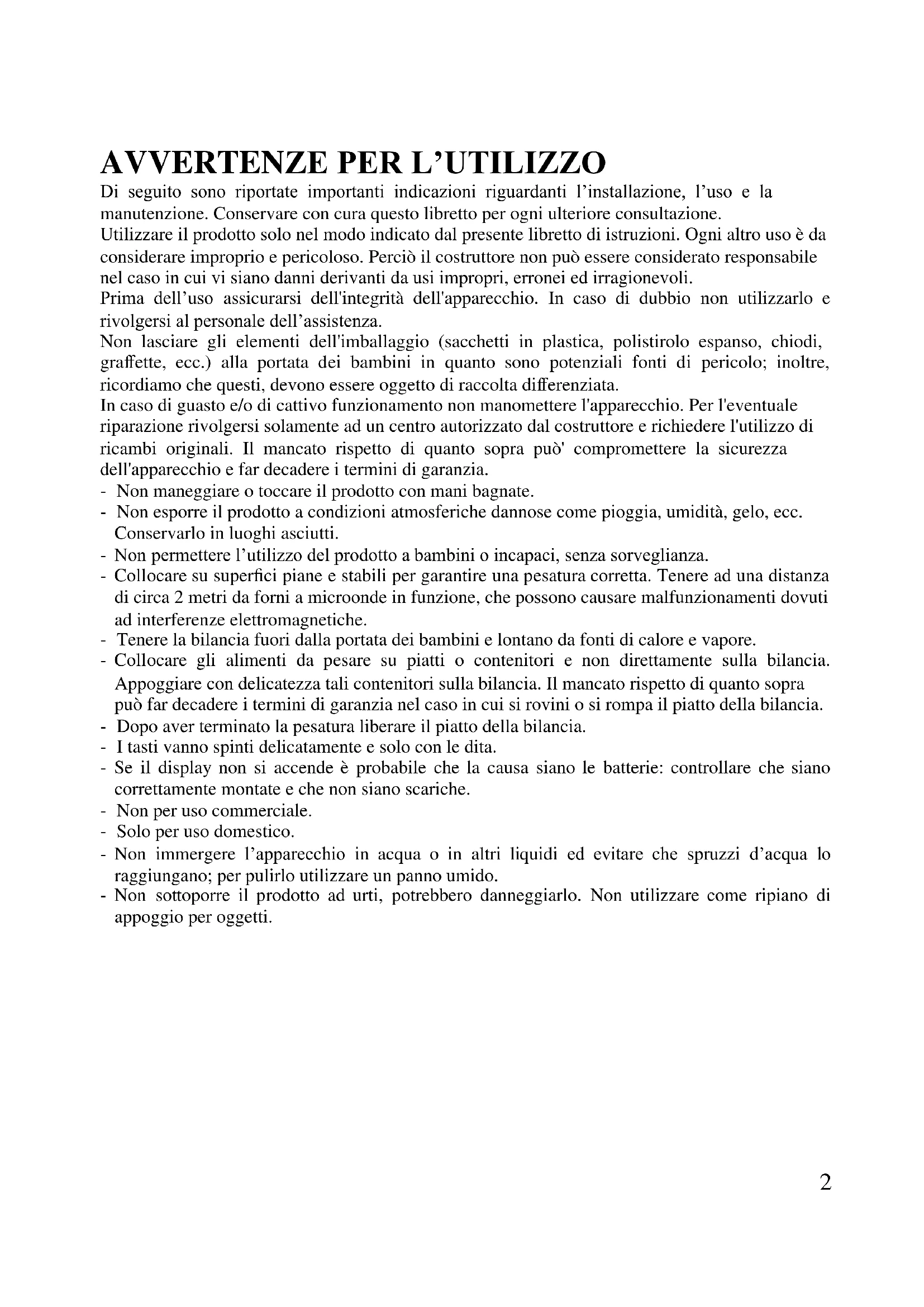 Di seguito sono riportate importanti indicazioni riguardanti l’installazione, l’uso e la manutenzione. Conservare con cura questo libretto per ogni ulteriore consultazione. Utilizzare il prodotto solo nel modo indicato dal presente libretto di istruzioni. Ogni altro uso è da considerare improprio e pericoloso. Perciò il costruttore non può essere considerato responsabile nel caso in cui vi siano danni derivanti da usi impropri, erronei ed irragionevoli. Prima dell’uso assicurarsi dell'integrità dell'apparecchio. In caso di dubbio non utilizzarlo e rivolgersi al personale dell’assistenza. Non lasciare gli elementi dell'imballaggio (sacchetti in plastica, polistirolo espanso, chiodi, graffette, ecc.) alla portata dei bambini in quanto sono potenziali fonti di pericolo; inoltre, ricordiamo che questi, devono essere oggetto di raccolta differenziata. In caso di guasto e/o di cattivo funzionamento non manomettere l'apparecchio. Per l'eventuale riparazione rivolgersi solamente ad un centro autorizzato dal costruttore e richiedere l'utilizzo di ricambi originali. Il mancato rispetto di quanto sopra può' compromettere la sicurezza dell'apparecchio e far decadere i termini di garanzia. - Non maneggiare o toccare il prodotto con mani bagnate. - Non esporre il prodotto a condizioni atmosferiche dannose come pioggia, umidità, gelo, ecc. Conservarlo in luoghi asciutti. - Non permettere l’utilizzo del prodotto a bambini o incapaci, senza sorveglianza. - Collocare su superfici piane e stabili per garantire una pesatura corretta. Tenere ad una distanza di circa 2 metri da forni a microonde in funzione, che possono causare malfunzionamenti dovuti ad interferenze elettromagnetiche. - Tenere la bilancia fuori dalla portata dei bambini e lontano da fonti di calore e vapore. - Collocare gli alimenti da pesare su piatti o contenitori e non direttamente sulla bilancia. Appoggiare con delicatezza tali contenitori sulla bilancia. Il mancato rispetto di quanto sopra può far decadere i termini di garanzia nel caso in cui si rovini o si rompa il piatto della bilancia. - Dopo aver terminato la pesatura liberare il piatto della bilancia. - I tasti vanno spinti delicatamente e solo con le dita. - Se il display non si accende è probabile che la causa siano le batterie: controllare che siano correttamente montate e che non siano scariche. - Non per uso commerciale. - Solo per uso domestico. - Non immergere l’apparecchio in acqua o in altri liquidi ed evitare che spruzzi d’acqua lo raggiungano; per pulirlo utilizzare un panno umido. - Non sottoporre il prodotto ad urti, potrebbero danneggiarlo. Non utilizzare come ripiano di appoggio per oggetti.3