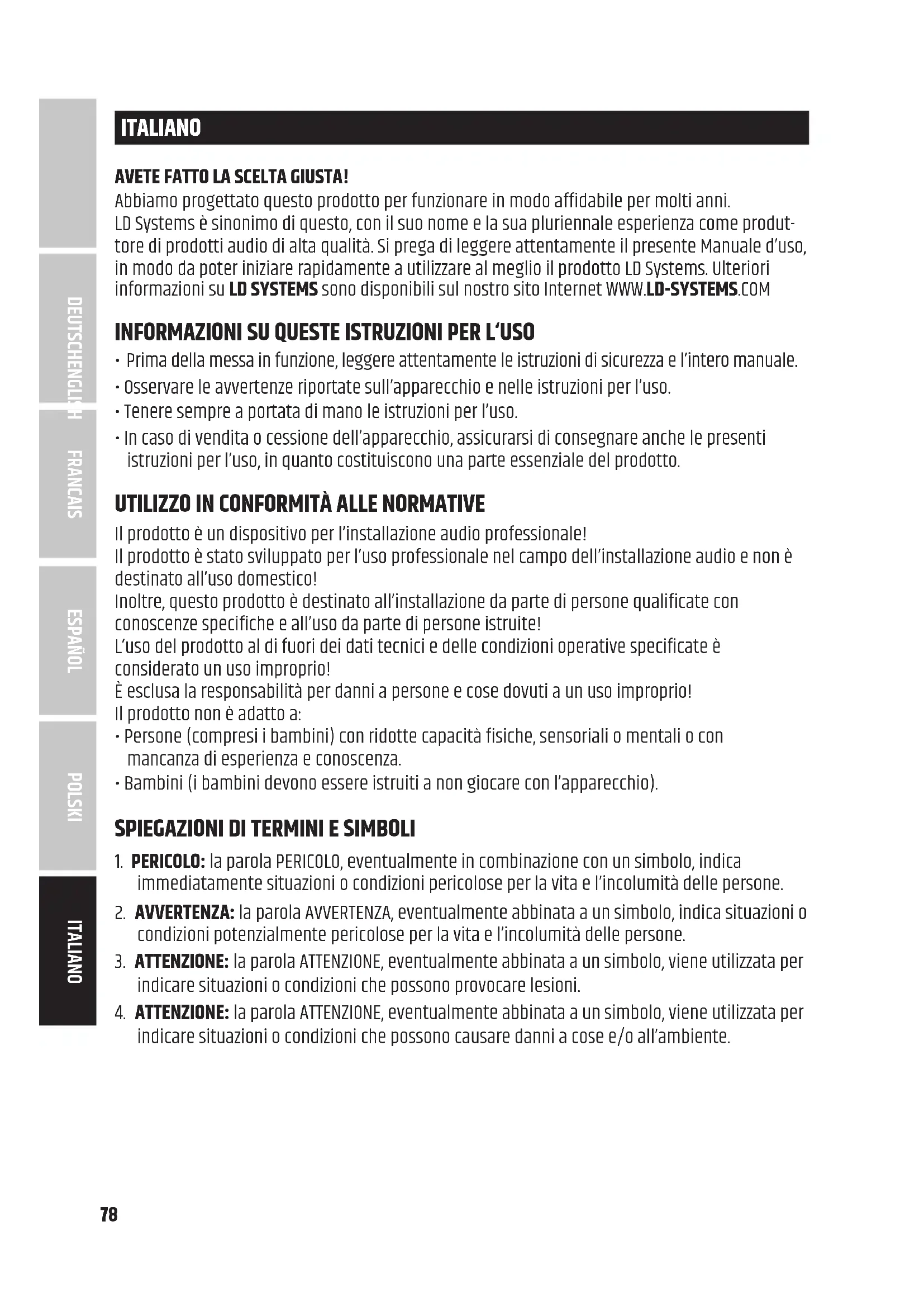 indicare situazioni o condizioni che possono causare danni a cose e/o all’ambiente. ITALIANO POLSKI ESPAÑOL FRANCAIS DEUTSCHENGLISH79 Questo simbolo indica i pericoli che possono causare scosse elettriche. Questo simbolo indica punti di pericolo o situazioni pericolose. Questo simbolo indica i pericoli dovuti alle superfici calde. Questo simbolo indica i pericoli dovuti a livelli di volume elevati. Questo simbolo indica informazioni supplementari sul funzionamento del prodotto. Questo simbolo indica un'unità che non contiene parti sostituibili dall'utente.
