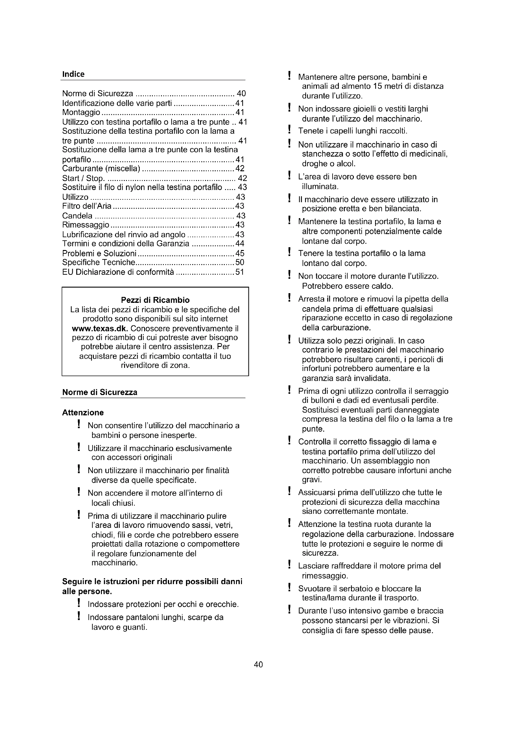 - Altre cause di cui Texas non può essere ritenuta responsabile. Le richieste di riaprazioni in garanzia devono essere esaminate ed accetate da un centro assistenza autorizzato. Il documento fiscale di acquisto è parte integrante della garanzia e deve essere conservato con cura. RICORDA: Per l’acquisto di pezzi di ricambio originali e per le richieste di riparazione in garanzia sono richiesti modello, anno di produzione e numero seriale della macchina. Questi dati sono riportati sull’Etichetta-CE applicata su ogn macchina!