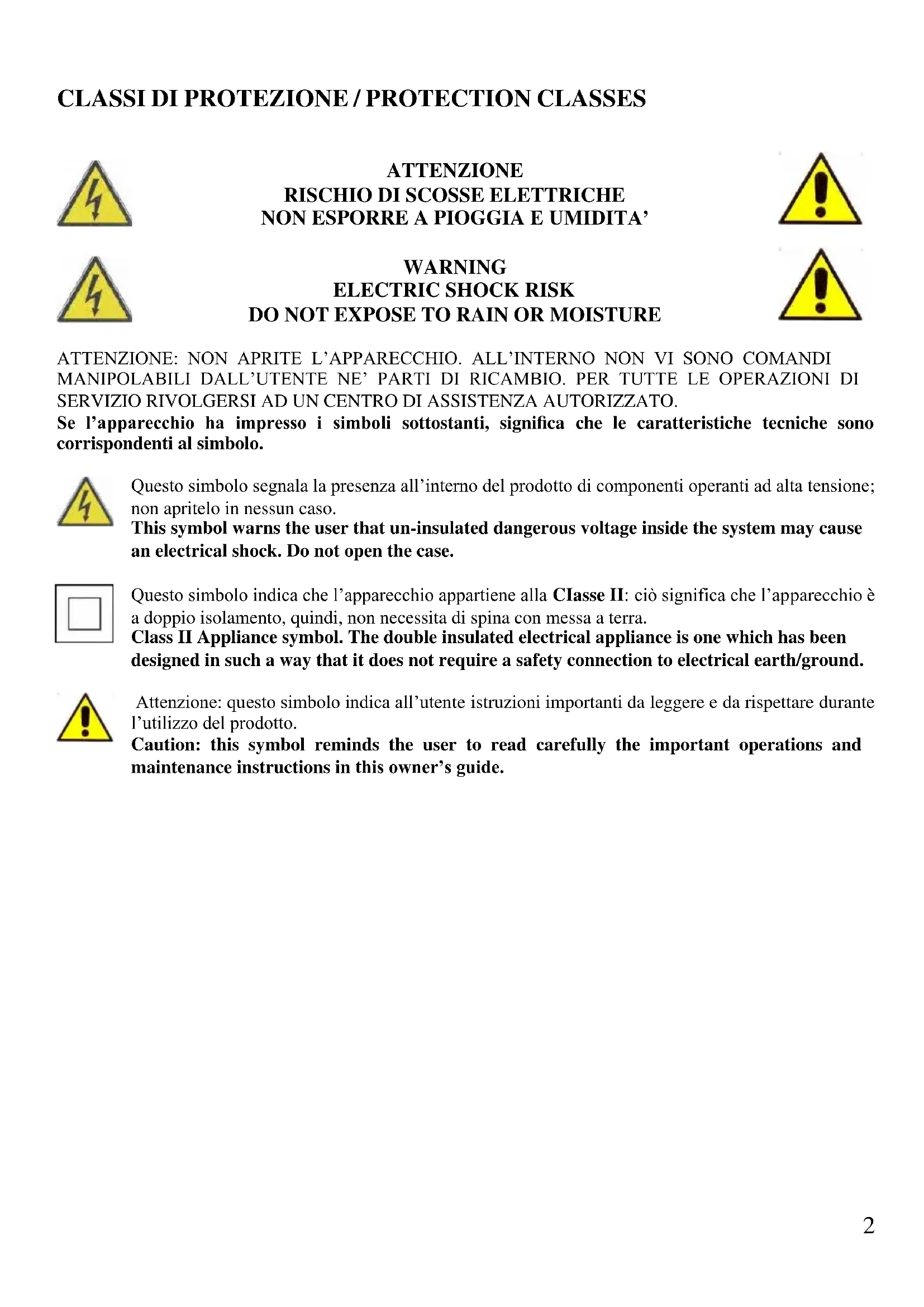 DO NOT EXPOSE TO RAIN OR MOISTURE ATTENZIONE: NON APRITE L’APPARECCHIO. ALL’INTERNO NON VI SONO COMANDI MANIPOLABILI DALL’UTENTE NE’ PARTI DI RICAMBIO. PER TUTTE LE OPERAZIONI DI SERVIZIO RIVOLGERSI AD UN CENTRO DI ASSISTENZA AUTORIZZATO. Se l’apparecchio ha impresso i simboli sottostanti, significa che le caratteristiche tecniche sono corrispondenti al simbolo. Questo simbolo segnala la presenza all’interno del prodotto di componenti operanti ad alta tensione; non apritelo in nessun caso. This symbol warns the user that un-insulated dangerous voltage inside the system may cause an electrical shock. Do not open the case. Questo simbolo indica che l’apparecchio appartiene alla CIasse II: ciò significa che l’apparecchio è a doppio isolamento, quindi, non necessita di spina con messa a terra. Class II Appliance symbol. The double insulated electrical appliance is one which has been designed in such a way that it does not require a safety connection to electrical earth/ground. Attenzione: questo simbolo indica all’utente istruzioni importanti da leggere e da rispettare durante l’utilizzo del prodotto. Caution: this symbol reminds the user to read carefully the important operations and maintenance instructions in this owner’s guide.3