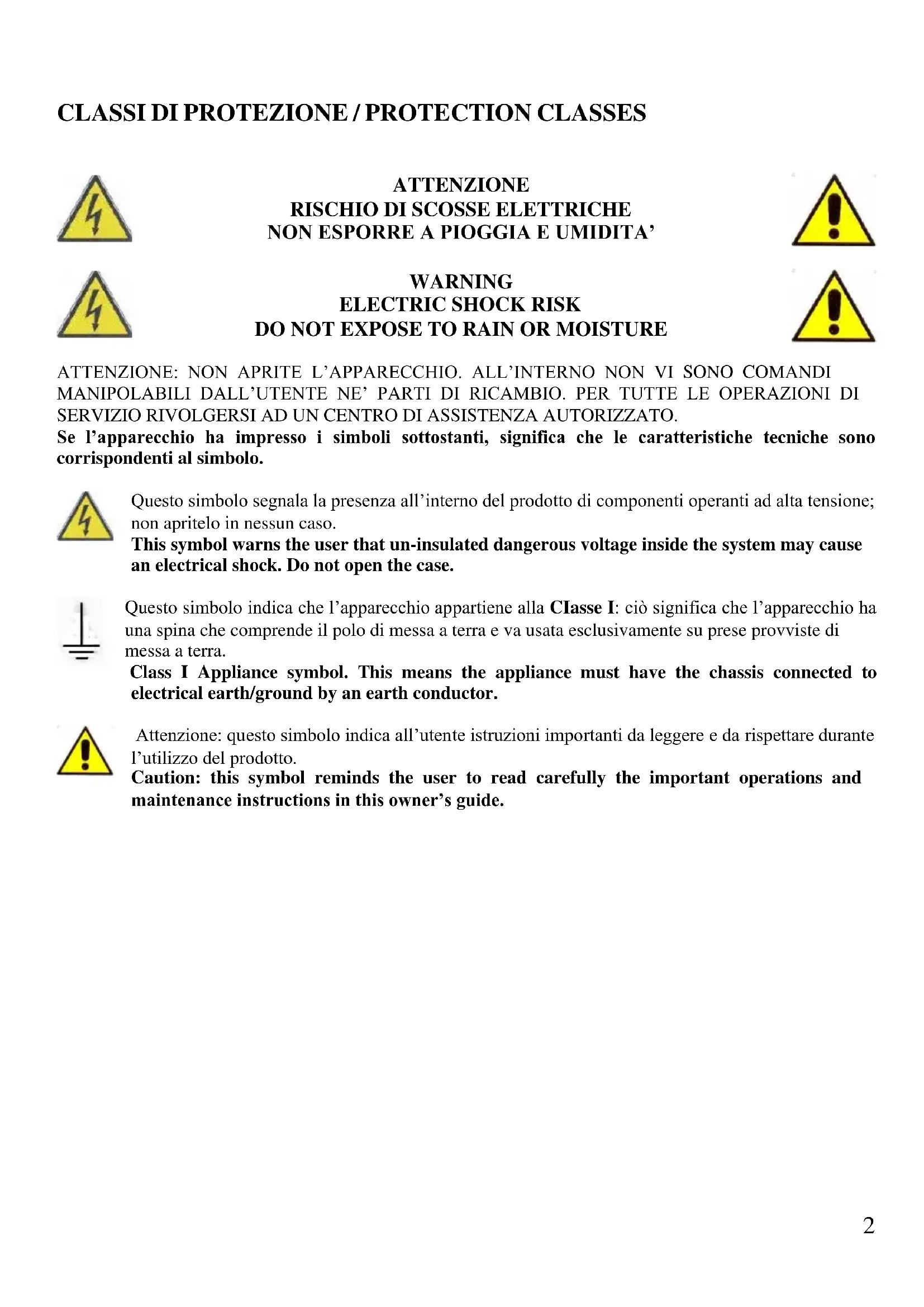 DO NOT EXPOSE TO RAIN OR MOISTURE ATTENZIONE: NON APRITE L’APPARECCHIO. ALL’INTERNO NON VI SONO COMANDI MANIPOLABILI DALL’UTENTE NE’ PARTI DI RICAMBIO. PER TUTTE LE OPERAZIONI DI SERVIZIO RIVOLGERSI AD UN CENTRO DI ASSISTENZA AUTORIZZATO. Se l’apparecchio ha impresso i simboli sottostanti, significa che le caratteristiche tecniche sono corrispondenti al simbolo. Questo simbolo segnala la presenza all’interno del prodotto di componenti operanti ad alta tensione; non apritelo in nessun caso. This symbol warns the user that un-insulated dangerous voltage inside the system may cause an electrical shock. Do not open the case. Questo simbolo indica che l’apparecchio appartiene alla CIasse I: ciò significa che l’apparecchio ha una spina che comprende il polo di messa a terra e va usata esclusivamente su prese provviste di messa a terra. Class I Appliance symbol. This means the appliance must have the chassis connected to electrical earth/ground by an earth conductor. Attenzione: questo simbolo indica all’utente istruzioni importanti da leggere e da rispettare durante l’utilizzo del prodotto. Caution: this symbol reminds the user to read carefully the important operations and maintenance instructions in this owner’s guide.3