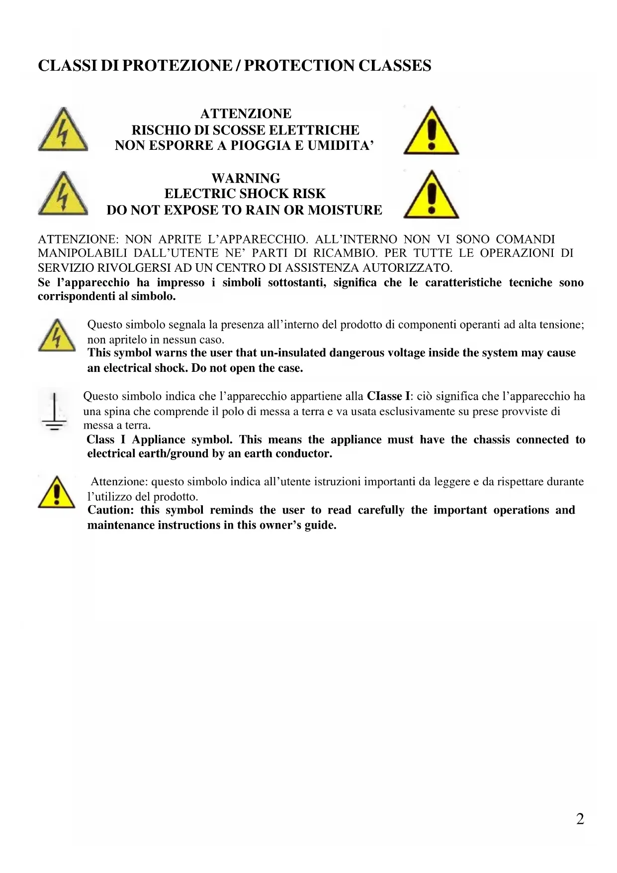 DO NOT EXPOSE TO RAIN OR MOISTURE ATTENZIONE: NON APRITE L’APPARECCHIO. ALL’INTERNO NON VI SONO COMANDI MANIPOLABILI DALL’UTENTE NE’ PARTI DI RICAMBIO. PER TUTTE LE OPERAZIONI DI SERVIZIO RIVOLGERSI AD UN CENTRO DI ASSISTENZA AUTORIZZATO. Se l’apparecchio ha impresso i simboli sottostanti, significa che le caratteristiche tecniche sono corrispondenti al simbolo. Questo simbolo segnala la presenza all’interno del prodotto di componenti operanti ad alta tensione; non apritelo in nessun caso. This symbol warns the user that un-insulated dangerous voltage inside the system may cause an electrical shock. Do not open the case. Questo simbolo indica che l’apparecchio appartiene alla CIasse I: ciò significa che l’apparecchio ha una spina che comprende il polo di messa a terra e va usata esclusivamente su prese provviste di messa a terra. Class I Appliance symbol. This means the appliance must have the chassis connected to electrical earth/ground by an earth conductor. Attenzione: questo simbolo indica all’utente istruzioni importanti da leggere e da rispettare durante l’utilizzo del prodotto. Caution: this symbol reminds the user to read carefully the important operations and maintenance instructions in this owner’s guide.3