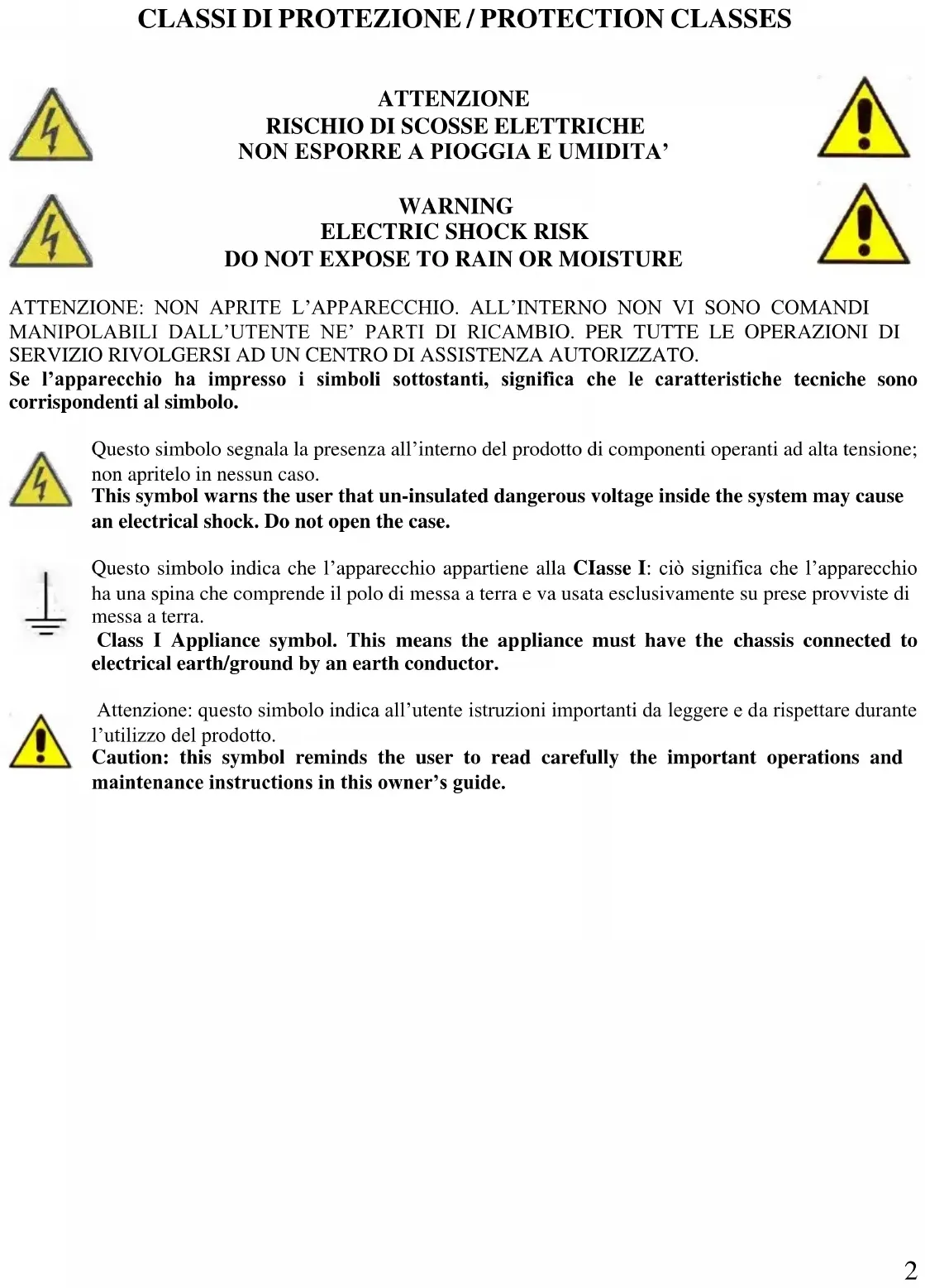 DO NOT EXPOSE TO RAIN OR MOISTURE ATTENZIONE: NON APRITE L’APPARECCHIO. ALL’INTERNO NON VI SONO COMANDI MANIPOLABILI DALL’UTENTE NE’ PARTI DI RICAMBIO. PER TUTTE LE OPERAZIONI DI SERVIZIO RIVOLGERSI AD UN CENTRO DI ASSISTENZA AUTORIZZATO. Se l’apparecchio ha impresso i simboli sottostanti, significa che le caratteristiche tecniche sono corrispondenti al simbolo. Questo simbolo segnala la presenza all’interno del prodotto di componenti operanti ad alta tensione; non apritelo in nessun caso. This symbol warns the user that un-insulated dangerous voltage inside the system may cause an electrical shock. Do not open the case. Questo simbolo indica che l’apparecchio appartiene alla CIasse I: ciò significa che l’apparecchio ha una spina che comprende il polo di messa a terra e va usata esclusivamente su prese provviste di messa a terra. Class I Appliance symbol. This means the appliance must have the chassis connected to electrical earth/ground by an earth conductor. Attenzione: questo simbolo indica all’utente istruzioni importanti da leggere e da rispettare durante l’utilizzo del prodotto. Caution: this symbol reminds the user to read carefully the important operations and maintenance instructions in this owner’s guide.3