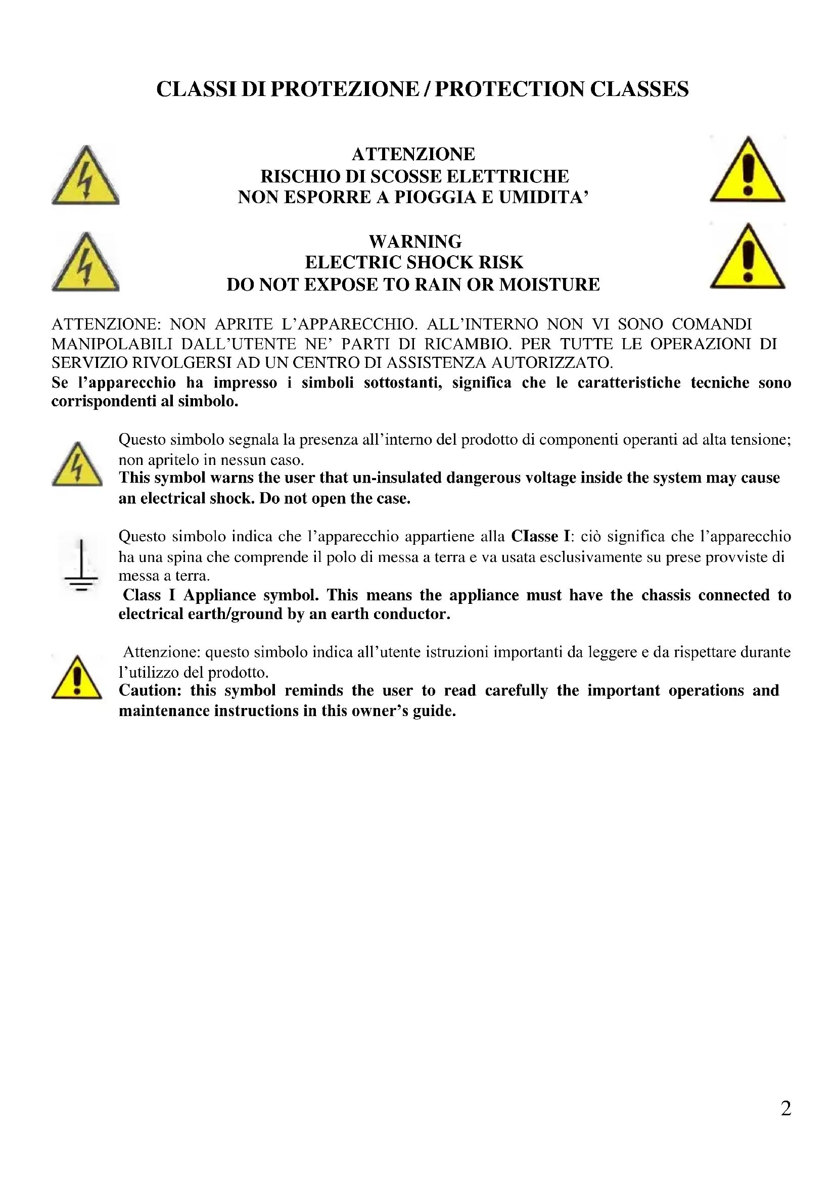 DO NOT EXPOSE TO RAIN OR MOISTURE ATTENZIONE: NON APRITE L’APPARECCHIO. ALL’INTERNO NON VI SONO COMANDI MANIPOLABILI DALL’UTENTE NE’ PARTI DI RICAMBIO. PER TUTTE LE OPERAZIONI DI SERVIZIO RIVOLGERSI AD UN CENTRO DI ASSISTENZA AUTORIZZATO. Se l’apparecchio ha impresso i simboli sottostanti, significa che le caratteristiche tecniche sono corrispondenti al simbolo. Questo simbolo segnala la presenza all’interno del prodotto di componenti operanti ad alta tensione; non apritelo in nessun caso. This symbol warns the user that un-insulated dangerous voltage inside the system may cause an electrical shock. Do not open the case. Questo simbolo indica che l’apparecchio appartiene alla CIasse I: ciò significa che l’apparecchio ha una spina che comprende il polo di messa a terra e va usata esclusivamente su prese provviste di messa a terra. Class I Appliance symbol. This means the appliance must have the chassis connected to electrical earth/ground by an earth conductor. Attenzione: questo simbolo indica all’utente istruzioni importanti da leggere e da rispettare durante l’utilizzo del prodotto. Caution: this symbol reminds the user to read carefully the important operations and maintenance instructions in this owner’s guide.3