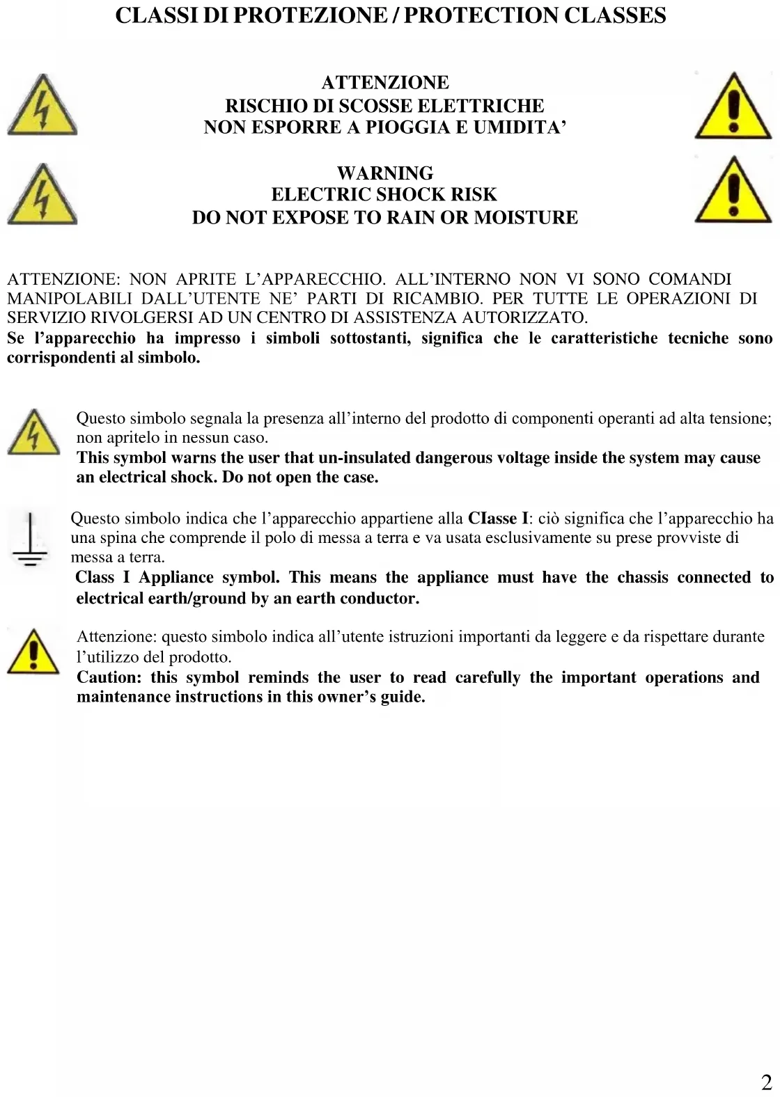 Questo simbolo segnala la presenza all’interno del prodotto di componenti operanti ad alta tensione; non apritelo in nessun caso. This symbol warns the user that un-insulated dangerous voltage inside the system may cause an electrical shock. Do not open the case. Questo simbolo indica che l’apparecchio appartiene alla CIasse I: ciò significa che l’apparecchio ha una spina che comprende il polo di messa a terra e va usata esclusivamente su prese provviste di messa a terra. Class I Appliance symbol. This means the appliance must have the chassis connected to electrical earth/ground by an earth conductor. Attenzione: questo simbolo indica all’utente istruzioni importanti da leggere e da rispettare durante l’utilizzo del prodotto. Caution: this symbol reminds the user to read carefully the important operations and maintenance instructions in this owner’s guide.3