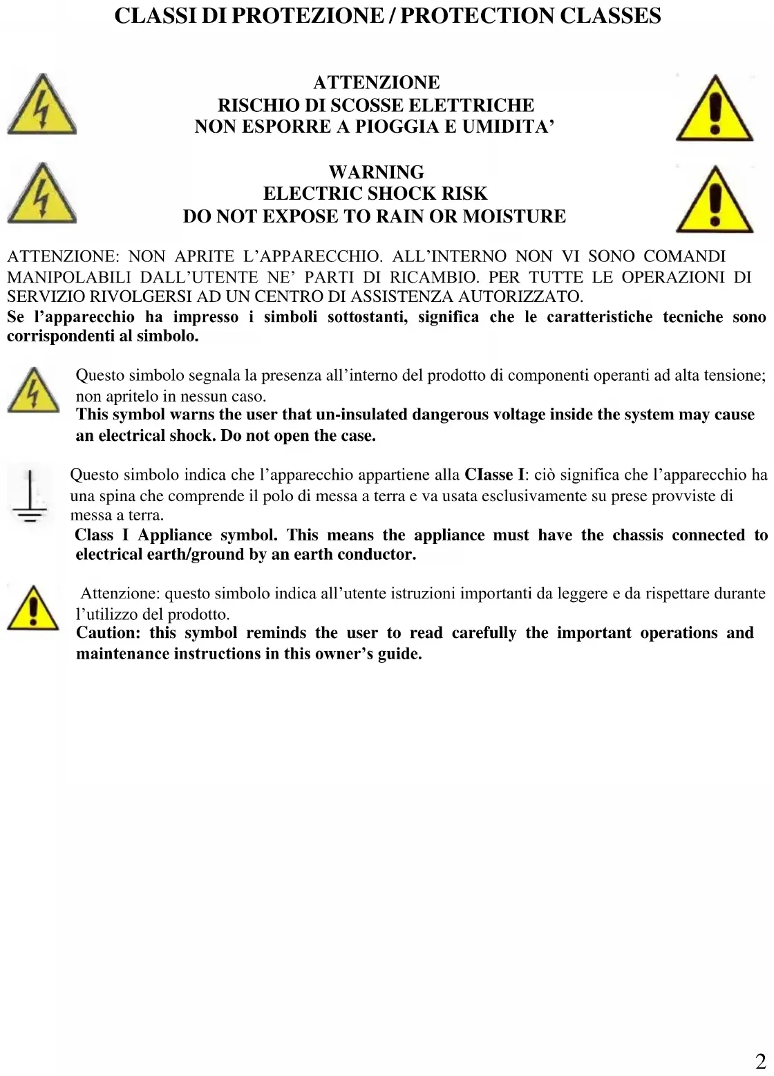 DO NOT EXPOSE TO RAIN OR MOISTURE ATTENZIONE: NON APRITE L’APPARECCHIO. ALL’INTERNO NON VI SONO COMANDI MANIPOLABILI DALL’UTENTE NE’ PARTI DI RICAMBIO. PER TUTTE LE OPERAZIONI DI SERVIZIO RIVOLGERSI AD UN CENTRO DI ASSISTENZA AUTORIZZATO. Se l’apparecchio ha impresso i simboli sottostanti, significa che le caratteristiche tecniche sono corrispondenti al simbolo. Questo simbolo segnala la presenza all’interno del prodotto di componenti operanti ad alta tensione; non apritelo in nessun caso. This symbol warns the user that un-insulated dangerous voltage inside the system may cause an electrical shock. Do not open the case. Questo simbolo indica che l’apparecchio appartiene alla CIasse I: ciò significa che l’apparecchio ha una spina che comprende il polo di messa a terra e va usata esclusivamente su prese provviste di messa a terra. Class I Appliance symbol. This means the appliance must have the chassis connected to electrical earth/ground by an earth conductor. Attenzione: questo simbolo indica all’utente istruzioni importanti da leggere e da rispettare durante l’utilizzo del prodotto. Caution: this symbol reminds the user to read carefully the important operations and maintenance instructions in this owner’s guide.3