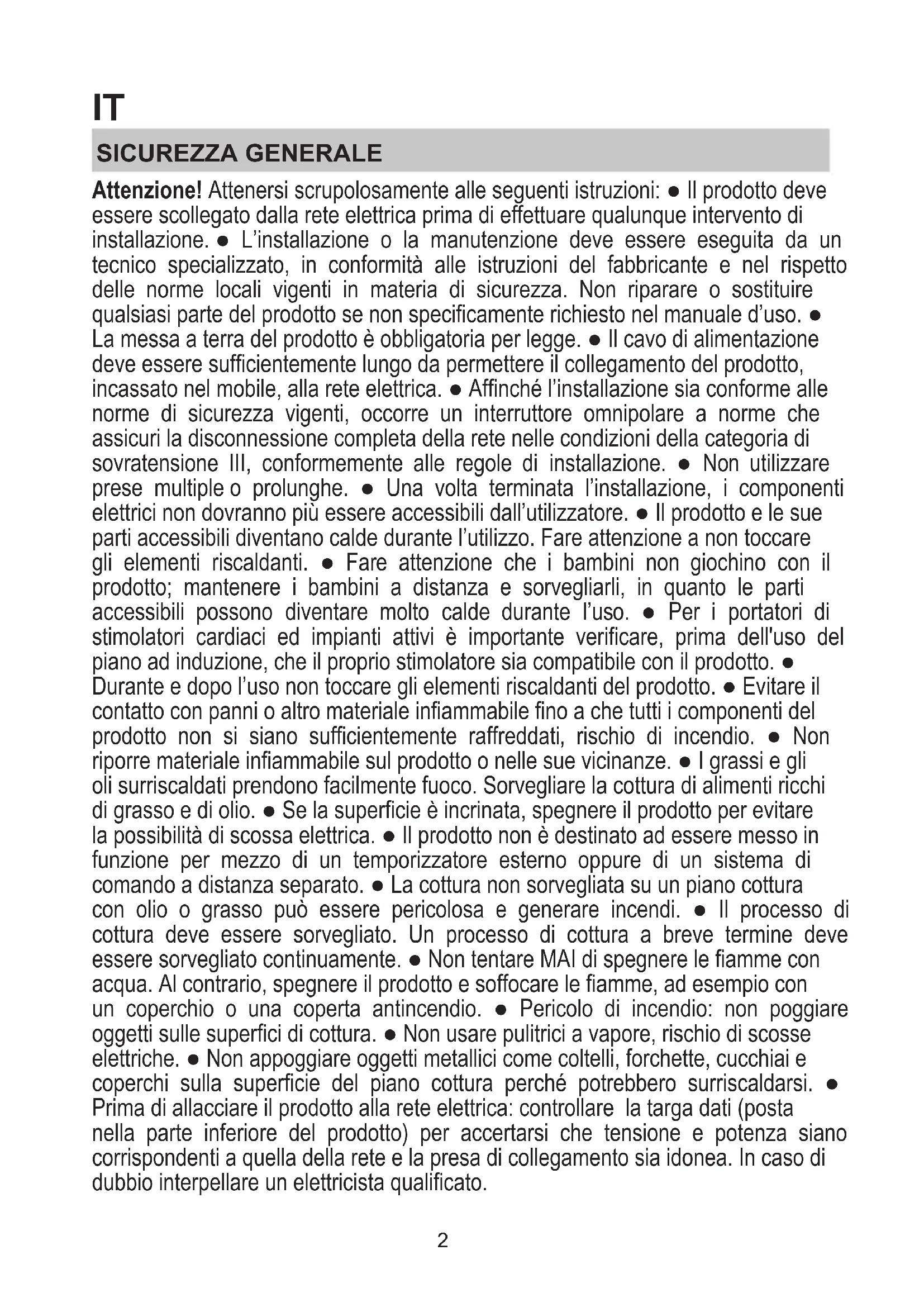 24NO! NO! NO! OK! OK!IT SICUREZZA GENERALE Attenzione! Attenersi scrupolosamente alle seguenti istruzioni: ● Il prodotto deve essere scollegato dalla rete elettrica prima di effettuare qualunque intervento di installazione. ● L’installazione o la manutenzione deve essere eseguita da un tecnico specializzato, in conformità alle istruzioni del fabbricante e nel rispetto delle norme locali vigenti in materia di sicurezza. Non riparare o sostituire qualsiasi parte del prodotto se non specificamente richiesto nel manuale d’uso. ● La messa a terra del prodotto è obbligatoria per legge. ● Il cavo di alimentazione deve essere sufficientemente lungo da permettere il collegamento del prodotto, incassato nel mobile, alla rete elettrica. ● Affinché l’installazione sia conforme alle norme di sicurezza vigenti, occorre un interruttore omnipolare a norme che assicuri la disconnessione completa della rete nelle condizioni della categoria di sovratensione III, conformemente alle regole di installazione. ● Non utilizzare prese multiple o prolunghe. ● Una volta terminata l’installazione, i componenti elettrici non dovranno più essere accessibili dall’utilizzatore. ● Il prodotto e le sue parti accessibili diventano calde durante l’utilizzo. Fare attenzione a non toccare gli elementi riscaldanti. ● Fare attenzione che i bambini non giochino con il prodotto; mantenere i bambini a distanza e sorvegliarli, in quanto le parti accessibili possono diventare molto calde durante l’uso. ● Per i portatori di stimolatori cardiaci ed impianti attivi è importante verificare, prima dell'uso del piano ad induzione, che il proprio stimolatore sia compatibile con il prodotto. ● Durante e dopo l’uso non toccare gli elementi riscaldanti del prodotto. ● Evitare il contatto con panni o altro materiale infiammabile fino a che tutti i componenti del prodotto non si siano sufficientemente raffreddati, rischio di incendio. ● Non riporre materiale infiammabile sul prodotto o nelle sue vicinanze. ● I grassi e gli oli surriscaldati prendono facilmente fuoco. Sorvegliare la cottura di alimenti ricchi di grasso e di olio. ● Se la superficie è incrinata, spegnere il prodotto per evitare la possibilità di scossa elettrica. ● Il prodotto non è destinato ad essere messo in funzione per mezzo di un temporizzatore esterno oppure di un sistema di comando a distanza separato. ● La cottura non sorvegliata su un piano cottura con olio o grasso può essere pericolosa e generare incendi. ● Il processo di cottura deve essere sorvegliato. Un processo di cottura a breve termine deve essere sorvegliato continuamente. ● Non tentare MAI di spegnere le fiamme con acqua. Al contrario, spegnere il prodotto e soffocare le fiamme, ad esempio con un coperchio o una coperta antincendio. ● Pericolo di incendio: non poggiare oggetti sulle superfici di cottura. ● Non usare pulitrici a vapore, rischio di scosse elettriche. ● Non appoggiare oggetti metallici come coltelli, forchette, cucchiai e coperchi sulla superficie del piano cottura perché potrebbero surriscaldarsi. ● Prima di allacciare il prodotto alla rete elettrica: controllare la targa dati (posta nella parte inferiore del prodotto) per accertarsi che tensione e potenza siano corrispondenti a quella della rete e la presa di collegamento sia idonea. In caso di dubbio interpellare un elettricista qualificato. 2Importante: ● Dopo l'uso, spegnere il piano cottura tramite il suo dispositivo di comando e non fare affidamento sul rivelatore di pentole. ● Evitare le fuoriuscite di liquido, pertanto per bollire o riscaldare liquidi, ridurre l’alimentazione di calore. ● Non lasciare gli elementi riscaldanti accesi con pentole e padelle vuote oppure senza recipienti. ● Una volta terminato di cucinare, spegnere la relativa zona di cottura. ● Per la cottura non utilizzate mai dei fogli di carta d'alluminio, e non posate mai direttamente prodotti imballati con alluminio. L'alluminio fonderebbe e danneggerebbe irrimediabilmente il vostro prodotto. ● Non riscaldare mai una scatoletta o un barattolo di latta contenente alimenti senza prima averlo aperto: potrebbe esplodere! Questa avvertenza si applica a tutti gli altri tipi di piani cottura. ● L'utilizzo di una potenza elevata come la funzione Booster non è adatta per il riscaldamento di alcuni liquidi come ad esempio l'olio per friggere. L'eccessivo calore potrebbe essere pericoloso. In questi casi si consiglia l'utilizzo di una potenza meno elevata. ● l recipienti devono essere posti direttamente sul piano cottura e devono essere centrati. In nessun caso inserire altri oggetti tra la pentola e il piano cottura. ● In situazione di elevate temperature il prodotto diminuisce automaticamente il livello di potenza delle zone di cottura. ● Prima di qualsiasi operazione di pulizia o manutenzione, disinserire il prodotto dalla rete elettrica togliendo la spina o staccando l’interruttore generale dell’abitazione. ● Per tutte le operazioni di installazione e manutenzione utilizzare guanti da lavoro. ● Il prodotto può essere utilizzato da bambini di età non inferiore a 8 anni e da persone con ridotte capacità fisiche, sensoriali o mentali, o prive di esperienza o della necessaria conoscenza, purché sotto sorveglianza oppure dopo che le stesse abbiano ricevuto istruzioni relative all’uso sicuro del prodotto e alla comprensione dei pericoli ad esso inerenti. ● I bambini devono essere controllati affinché non giochino con il prodotto. ● La pulizia e la manutenzione non deve essere effettuata da bambini senza sorveglianza. ● Il locale deve disporre di sufficiente ventilazione, quando il prodotto viene utilizzato contemporaneamente ad altri apparecchi a combustione di gas o altri combustibili. ● Il prodotto va frequentemente pulito sia internamente che esternamente (ALMENO UNA VOLTA AL MESE), rispettare comunque quanto espressamente indicato nelle istruzioni di manutenzio