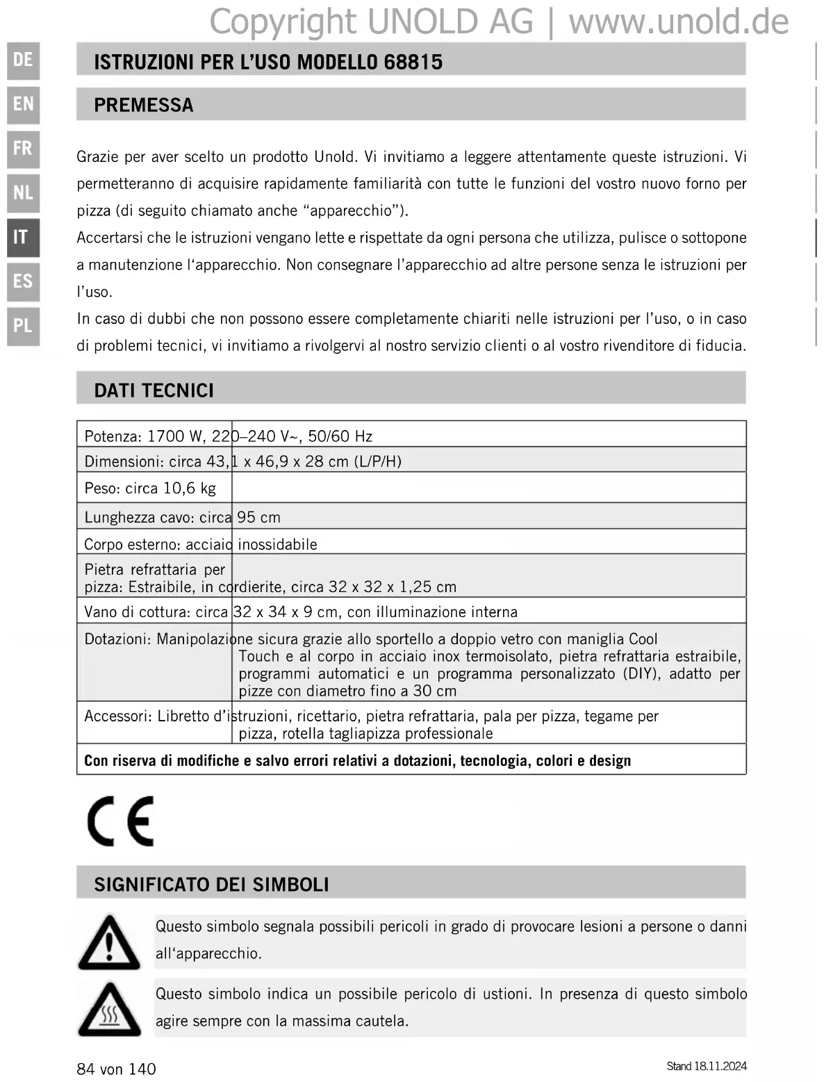 PREMESSA Grazie per aver scelto un prodotto Unold. Vi invitiamo a leggere attentamente queste istruzioni. Vi permetteranno di acquisire rapidamente familiarità con tutte le funzioni del vostro nuovo forno per pizza (di seguito chiamato anche “apparecchio”). Accertarsi che le istruzioni vengano lette e rispettate da ogni persona che utilizza, pulisce o sottopone a manutenzione l‘apparecchio. Non consegnare l’apparecchio ad altre persone senza le istruzioni per l’uso. In caso di dubbi che non possono essere completamente chiariti nelle istruzioni per l’uso, o in caso di problemi tecnici, vi invitiamo a rivolgervi al nostro servizio clienti o al vostro rivenditore di fiducia. DATI TECNICI Potenza: 1700 W, 220–240 V~, 50/60 Hz Dimensioni: circa 43,1 x 46,9 x 28 cm (L/P/H) Peso: circa 10,6 kg Lunghezza cavo: circa 95 cm Corpo esterno: acciaio inossidabile Pietra refrattaria per pizza: Estraibile, in cordierite, circa 32 x 32 x 1,25 cm Vano di cottura: circa 32 x 34 x 9 cm, con illuminazione interna Dotazioni: Manipolazione sicura grazie allo sportello a doppio vetro con maniglia Cool Touch e al corpo in acciaio inox termoisolato, pietra refrattaria estraibile, programmi automatici e un programma personalizzato (DIY), adatto per pizze con diametro fino a 30 cm Accessori: Libretto d’istruzioni, ricettario, pietra refrattaria, pala per pizza, tegame per pizza, rotella tagliapizza professionale Con riserva di modifiche e salvo errori relativi a dotazioni, tecnologia, colori e design