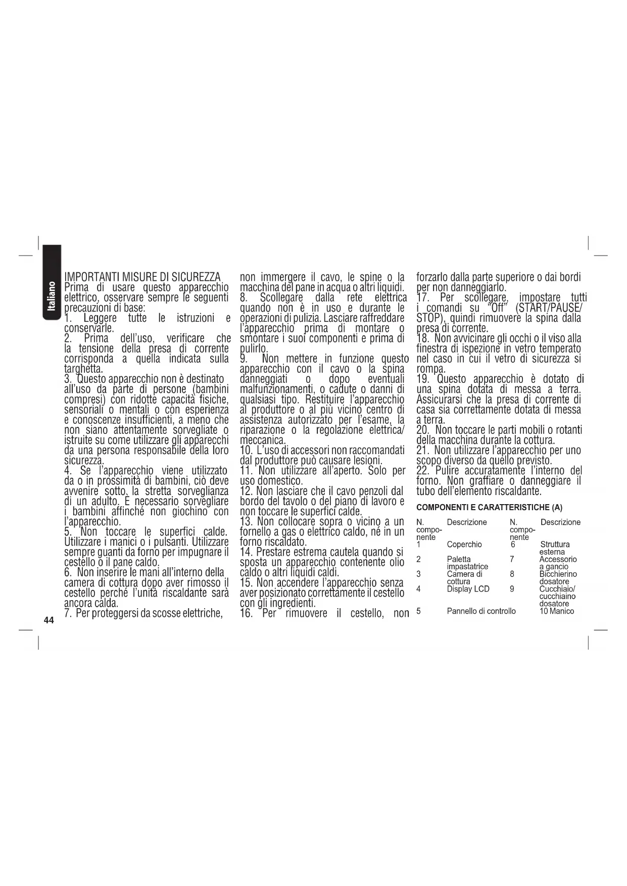 forno. Non graffiare o danneggiare il tubo dell’elemento riscaldante. COMPONENTI E CARATTERISTICHE (A) N. Descrizione N. Descrizione compo- compo- nente nente 1 Coperchio 6 Struttura esterna 2 Paletta 7 Accessorio impastatrice a gancio 3 Camera di 8 Bicchierino cottura dosatore 4 Display LCD 9 Cucchiaio/ cucchiaino dosatore 5 Pannello di controllo 10 Manico45 forzarlo dalla parte superiore o dai bordi per non danneggiarlo.