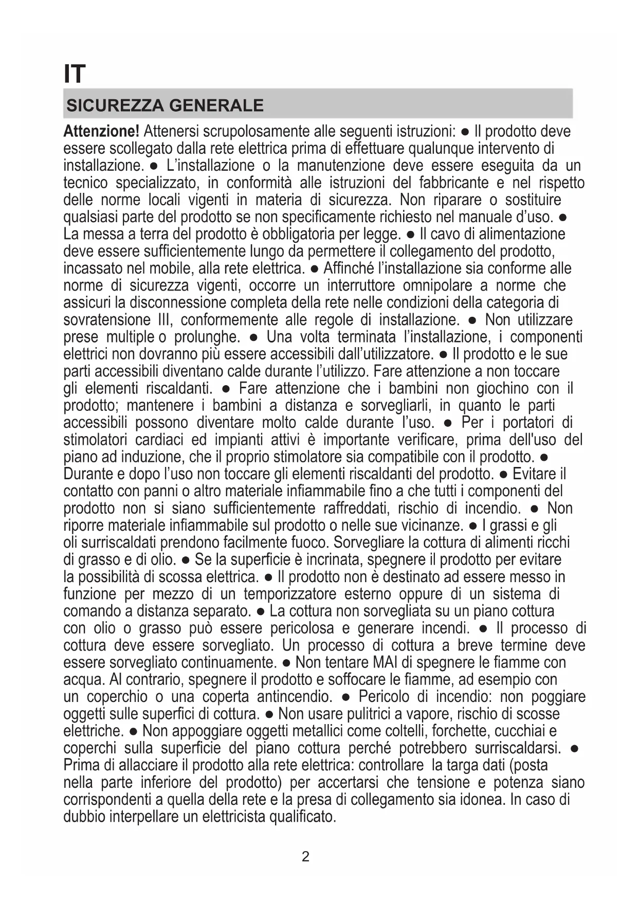 1xIT SICUREZZA GENERALE Attenzione! Attenersi scrupolosamente alle seguenti istruzioni: ● Il prodotto deve essere scollegato dalla rete elettrica prima di effettuare qualunque intervento di installazione. ● L’installazione o la manutenzione deve essere eseguita da un tecnico specializzato, in conformità alle istruzioni del fabbricante e nel rispetto delle norme locali vigenti in materia di sicurezza. Non riparare o sostituire qualsiasi parte del prodotto se non specificamente richiesto nel manuale d’uso. ● La messa a terra del prodotto è obbligatoria per legge. ● Il cavo di alimentazione deve essere sufficientemente lungo da permettere il collegamento del prodotto, incassato nel mobile, alla rete elettrica. ● Affinché l’installazione sia conforme alle norme di sicurezza vigenti, occorre un interruttore omnipolare a norme che assicuri la disconnessione completa della rete nelle condizioni della categoria di sovratensione III, conformemente alle regole di installazione. ● Non utilizzare prese multiple o prolunghe. ● Una volta terminata l’installazione, i componenti elettrici non dovranno più essere accessibili dall’utilizzatore. ● Il prodotto e le sue parti accessibili diventano calde durante l’utilizzo. Fare attenzione a non toccare gli elementi riscaldanti. ● Fare attenzione che i bambini non giochino con il prodotto; mantenere i bambini a distanza e sorvegliarli, in quanto le parti accessibili possono diventare molto calde durante l’uso. ● Per i portatori di stimolatori cardiaci ed impianti attivi è importante verificare, prima dell'uso del piano ad induzione, che il proprio stimolatore sia compatibile con il prodotto. ● Durante e dopo l’uso non toccare gli elementi riscaldanti del prodotto. ● Evitare il contatto con panni o altro materiale infiammabile fino a che tutti i componenti del prodotto non si siano sufficientemente raffreddati, rischio di incendio. ● Non riporre materiale infiammabile sul prodotto o nelle sue vicinanze. ● I grassi e gli oli surriscaldati prendono facilmente fuoco. Sorvegliare la cottura di alimenti ricchi di grasso e di olio. ● Se la superficie è incrinata, spegnere il prodotto per evitare la possibilità di scossa elettrica. ● Il prodotto non è destinato ad essere messo in funzione per mezzo di un temporizzatore esterno oppure di un sistema di comando a distanza separato. ● La cottura non sorvegliata su un piano cottura con olio o grasso può essere pericolosa e generare incendi. ● Il processo di cottura deve essere sorvegliato. Un processo di cottura a breve termine deve essere sorvegliato continuamente. ● Non tentare MAI di spegnere le fiamme con acqua. Al contrario, spegnere il prodotto e soffocare le fiamme, ad esempio con un coperchio o una coperta antincendio. ● Pericolo di incendio: non poggiare oggetti sulle superfici di cottura. ● Non usare pulitrici a vapore, rischio di scosse elettriche. ● Non appoggiare oggetti metallici come coltelli, forchette, cucchiai e coperchi sulla superficie del piano cottura perché potrebbero surriscaldarsi. ● Prima di allacciare il prodotto alla rete elettrica: controllare la targa dati (posta nella parte inferiore del prodotto) per accertarsi che tensione e potenza siano corrispondenti a quella della rete e la presa di collegamento sia idonea. In caso di dubbio interpellare un elettricista qualificato. 2Importante: ● Dopo l'uso, spegnere il piano cottura tramite il suo dispositivo di comando e non fare affidamento sul rivelatore di pentole. ● Evitare le fuoriuscite di liquido, pertanto per bollire o riscaldare liquidi, ridurre l’alimentazione di calore. ● Non lasciare gli elementi riscaldanti accesi con pentole e padelle vuote oppure senza recipienti. ● Una volta terminato di cucinare, spegnere la relativa zona di cottura. ● Per la cottura non utilizzate mai dei fogli di carta d'alluminio, e non posate mai direttamente prodotti imballati con alluminio. L'alluminio fonderebbe e danneggerebbe irrimediabilmente il vostro prodotto. ● Non riscaldare mai una scatoletta o un barattolo di latta contenente alimenti senza prima averlo aperto: potrebbe esplodere! Questa avvertenza si applica a tutti gli altri tipi di piani cottura. ● L'utilizzo di una potenza elevata come la funzione Booster non è adatta per il riscaldamento di alcuni liquidi come ad esempio l'olio per friggere. L'eccessivo calore potrebbe essere pericoloso. In questi casi si consiglia l'utilizzo di una potenza meno elevata. ● l recipienti devono essere posti direttamente sul piano cottura e devono essere centrati. In nessun caso inserire altri oggetti tra la pentola e il piano cottura. ● In situazione di elevate temperature il prodotto diminuisce automaticamente il livello di potenza delle zone di cottura. ● Prima di qualsiasi operazione di pulizia o manutenzione, disinserire il prodotto dalla rete elettrica togliendo la spina o staccando l’interruttore generale dell’abitazione. ● Per tutte le operazioni di installazione e manutenzione utilizzare guanti da lavoro. ● Il prodotto può essere utilizzato da bambini di età non inferiore a 8 anni e da persone con ridotte capacità fisiche, sensoriali o mentali, o prive di esperienza o della necessaria conoscenza, purché sotto sorveglianza oppure dopo che le stesse abbiano ricevuto istruzioni relative all’uso sicuro del prodotto e alla comprensione dei pericoli ad esso inerenti. ● I bambini devono essere controllati affinché non giochino con il prodotto. ● La pulizia e la manutenzione non deve essere effettuata da bambini senza sorveglianza. ● Il locale deve disporre di sufficiente ventilazione, quando il prodotto viene utilizzato contemporaneamente ad altri apparecchi a combustione di gas o altri combustibili. ● Il prodotto va frequentemente pulito sia internamente che esternamente (ALMENO UNA VOLTA AL MESE), rispettare comunque quanto espressamente indicato nelle istruzioni di manutenzione. ● L’inosser