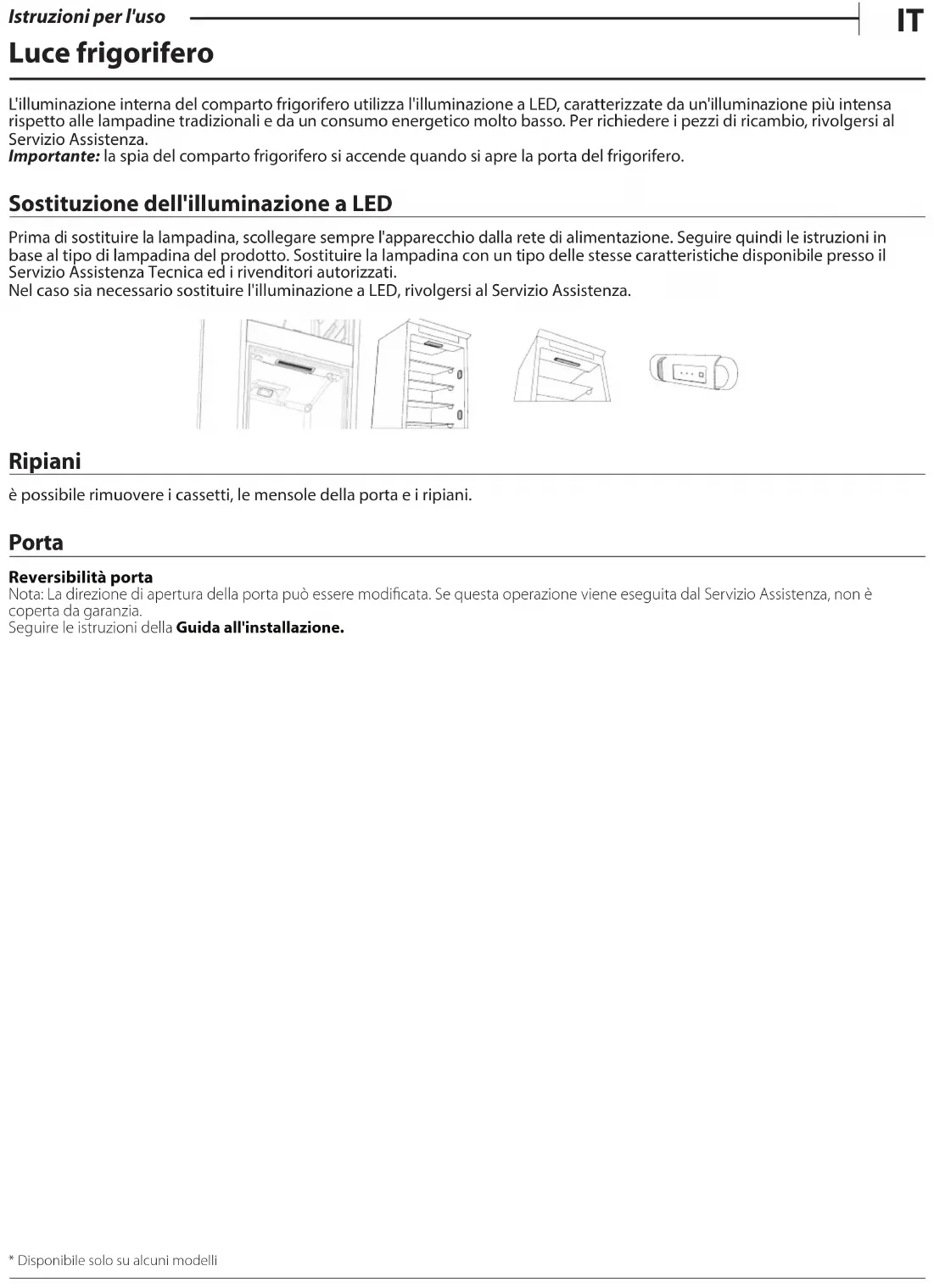 Istruzioni per l'uso Luce frigorifero L'illuminazione interna del comparto frigorifero utilizza l'illuminazione a LED, caratterizzate da un'illuminazione più intensa rispetto alle lampadine tradizionali e da un consumo energetico molto basso. Per richiedere i pezzi di ricambio, rivolgersi al Servizio Assistenza. Importante: la spia del comparto frigorifero si accende quando si apre la porta del frigorifero. Sostituzione dell'illuminazione a LED Prima di sostituire la lampadina, scollegare sempre l'apparecchio dalla rete di alimentazione. Seguire quindi le istruzioni in base al tipo di lampadina del prodotto. Sostituire la lampadina con un tipo delle stesse caratteristiche disponibile presso il Servizio Assistenza Tecnica ed i rivenditori autorizzati. Nel caso sia necessario sostituire l'illuminazione a LED, rivolgersi al Servizio Assistenza. Ripiani è possibile rimuovere i cassetti, le mensole della porta e i ripiani. Porta Reversibilità porta Nota: La direzione di apertura della porta può essere modificata. Se questa operazione viene eseguita dal Servizio Assistenza, non è coperta da garanzia.Seguire le istruzioni della Guida all'installazione.* Disponibile solo su alcuni modelli4 Istruzioni per l'uso Utilizzo dell'apparecchio Primo utilizzo Dopo l'installazione, attendere almeno due ore prima di collegare l'apparecchio alla rete elettrica. Collegandolo alla rete di alimentazione, l’apparecchio si avvia automaticamente. Le temperature di conservazione ideali per gli alimenti sono preimpostate in fabbrica. Dopo la messa in funzione, attendere 4-6 ore prima che venga raggiunta la temperatura di conservazione adeguata per un carico normale dell'apparecchio. Posizionare il ltro antibatterico-antiodore nella ventola come indicato sulla confezione del ltro (se disponibile). Se viene emesso il segnale acustico, signica che si è attivato l'allarme di temperatura: premere il tasto per disattivare l’allarme acustico. Comparto frigorifero e conservazione degli alimenti Il comparto frigorifero consente la conservazione di alimenti freschi e bevande. Lo sbrinamento del comparto frigorifero è completamente automatico. La presenza periodica di goccioline d’acqua sulla parete posteriore interna del comparto evidenzia la fase di sbrinamento automatico. L’acqua di sbrinamento viene convogliata in un foro di scarico, quindi raccolta in un contenitore ove evapora. Nota: la temperatura ambiente, la frequenza di apertura delle porte e la posizione dell'apparecchio possono influenzare le temperature interne dei due comparti. Impostare le temperature in funzione di questi fattori. In condizioni di forte umidità, nel comparto frigorifero e specialmente sui ripiani in vetro si può formare della condensa. In tal caso si consiglia di chiudere i contenitori con all’interno dei liquidi (esempio: pentole di brodo), confezionare gli alimenti ad elevato contenuto di umidità (esempio: verdure) e accendere la ventola, se presente. è possibile rimuovere i cassetti, le mensole della porta e i ripiani. Ventilazione aria multiflusso Il multiow aiuta a distribuire uniformemente l'aria fredda nella cavità per una migliore conservazione degli alimenti. Gli alimenti possono essere collocati su qualsiasi ripiano dell'apparecchio. Si prega di prestare attenzione a non ostruire le bocchette di distribuzione dell'aria, garantendo così la libera circolazione della stessa. Come conservare alimenti e bevande freschi Gli alimenti che emanano grandi quantità di etilene (mele, albicocche, pere, pesche, avocado, chi, prugne, mirtilli, meloni, fagioli) o che sono sensibili a questo gas, come frutta, verdura e insalate, dovrebbero essere separati o avvolti per favorirne una conservazione più lunga; ad esempio, non conservare i pomodori insieme a cavoli o kiwi. Non disporre gli alimenti a distanza troppo ravvicinata, in modo da consentire una suciente circolazione dell'aria. Utilizzare contenitori di metallo, alluminio, vetro e plastica riciclabile e avvolgere gli alimenti con una pellicola trasparente. Se gli alimenti da conservare nel frigorifero occupano solo una parte dello spazio disponibile, si consiglia di utilizzare i ripiani sopra il cassetto frutta e verdura in quanto è la zona più fredda del comparto. Utilizzare sempre contenitori chiusi per i liquidi e per gli alimenti che potrebbero emettere odori o essere contaminati da odori o aromi. Per evitare la caduta delle bottiglie, usare l'apposito accessorio di tenuta (disponibile in alcuni modelli).