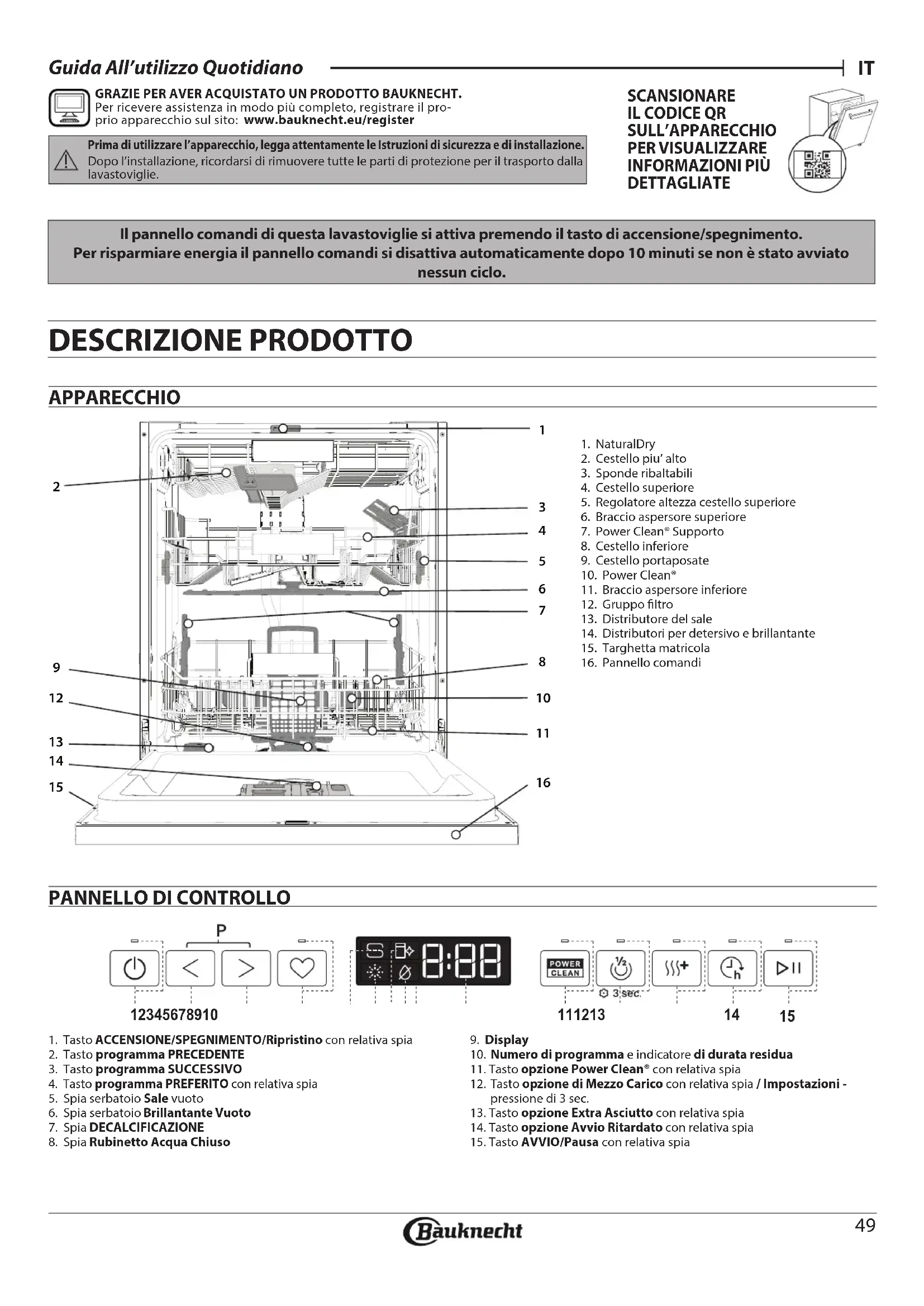 DESCRIZIONE PRODOTTO Il pannello comandi di questa lavastoviglie si attiva premendo il tasto di accensione/spegnimento. Per risparmiare energia il pannello comandi si disattiva automaticamente dopo 10 minuti se non è stato avviato nessun ciclo. APPARECCHIO 1. NaturalDry2. Cestello piu’ alto3. Sponde ribaltabili4. Cestello superiore5. Regolatore altezza cestello superiore6. Braccio aspersore superiore7. Power Clean® Supporto8. Cestello inferiore9. Cestello portaposate10. Power Clean®11. Braccio aspersore inferiore12. Gruppo ltro13. Distributore del sale14. Distributori per detersivo ebrillantante15. Targhetta matricola16. Pannello comandi1. Tasto ACCENSIONE/SPEGNIMENTO/Ripristino con relativa spia2. Tasto programma PRECEDENTE3. Tasto programma SUCCESSIVO4. Tasto programma PREFERITO con relativa spia5. Spia serbatoio Sale vuoto6. Spia serbatoio Brillantante Vuoto7. Spia DECALCIFICAZIONE8. Spia Rubinetto Acqua Chiuso9. Display