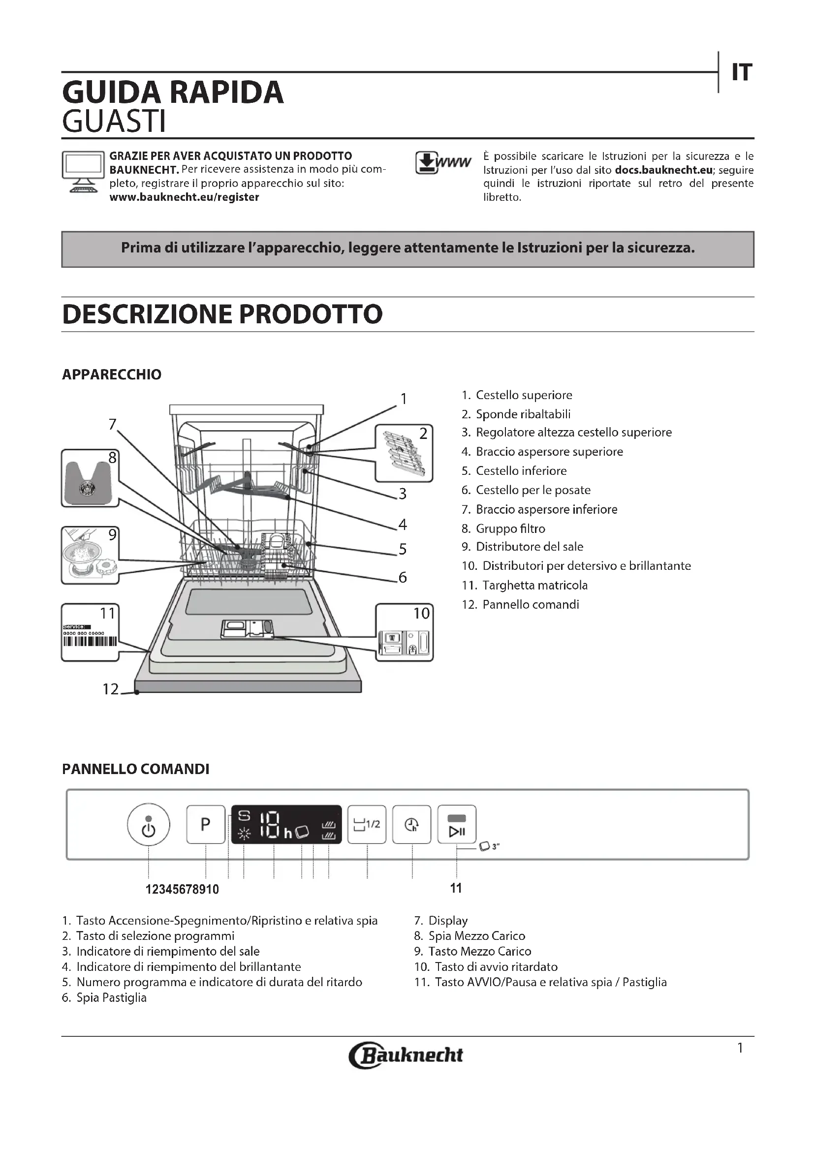 Prima di utilizzare l’apparecchio, leggere attentamente le Istruzioni per la sicurezza. APPARECCHIO DESCRIZIONE PRODOTTO 1. Cestello superiore2. Sponde ribaltabili3. Regolatore altezza cestello superiore4. Braccio aspersore superiore5. Cestello inferiore6. Cestello per le posate7. Braccio aspersore inferiore8. Gruppo ltro9. Distributore del sale10. Distributori per detersivo e brillantante11. Targhetta matricola12. Pannello comandi1. Tasto Accensione-Spegnimento/Ripristino e relativa spia2. Tasto di selezione programmi3. Indicatore di riempimento del sale4. Indicatore di riempimento del brillantante5. Numero programma e indicatore di durata del ritardo6. Spia Pastiglia7. Display8. Spia Mezzo Carico9. Tasto Mezzo Carico10. Tasto di avvio ritardato11. Tasto AVVIO/Pausa e relativa spia / Pastiglia GUIDA RAPIDA GUASTI PANNELLO COMANDI GRAZIE PER AVER ACQUISTATO UN PRODOTTO BAUKNECHT Per ricevere assistenza in modo più com-pleto, registrare il proprio apparecchio sul sito: www.bauknecht.eu/registerÈ possibile scaricare le Istruzioni per la sicurezza e le Istruzioni per l’uso dal sito docs.bauknecht.eu; seguire quindi le istruzioni riportate sul retro del presente libretto.0000 000 00000 Service: