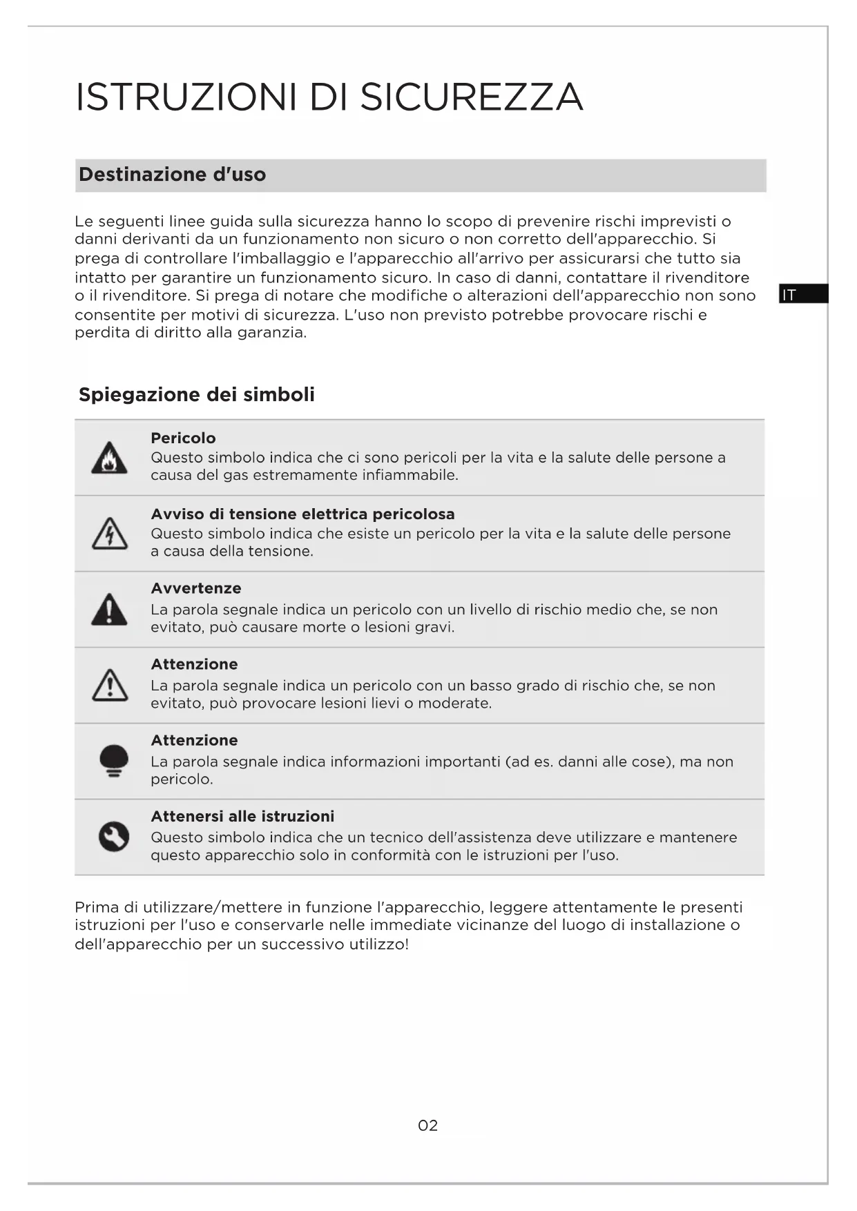 Le seguenti linee guida sulla sicurezza hanno lo scopo di prevenire rischi imprevisti o danni derivanti da un funzionamento non sicuro o non corretto dell'apparecchio. Si prega di controllare l'imballaggio e l'apparecchio all'arrivo per assicurarsi che tutto sia intatto per garantire un funzionamento sicuro. In caso di danni, contattare il rivenditore o il rivenditore. Si prega di notare che modifiche o alterazioni dell'apparecchio non sono consentite per motivi di sicurezza. L'uso non previsto potrebbe provocare rischi e perdita di diritto alla garanzia. Prima di utilizzare/mettere in funzione l'apparecchio, leggere attentamente le presenti istruzioni per l'uso e conservarle nelle immediate vicinanze del luogo di installazione o dell'apparecchio per un successivo utilizzo! Questo simbolo indica che ci sono pericoli per la vita e la salute delle persone a causa del gas estremamente infiammabile. Questo simbolo indica che esiste un pericolo per la vita e la salute delle persone a causa della tensione. La parola segnale indica un pericolo con un livello di rischio medio che, se non evitato, può causare morte o lesioni gravi. La parola segnale indica un pericolo con un basso grado di rischio che, se non evitato, può provocare lesioni lievi o moderate. La parola segnale indica informazioni importanti (ad es. danni alle cose), ma non pericolo. Questo simbolo indica che un tecnico dell'assistenza deve utilizzare e mantenere questo apparecchio solo in conformità con le istruzioni per l'uso.