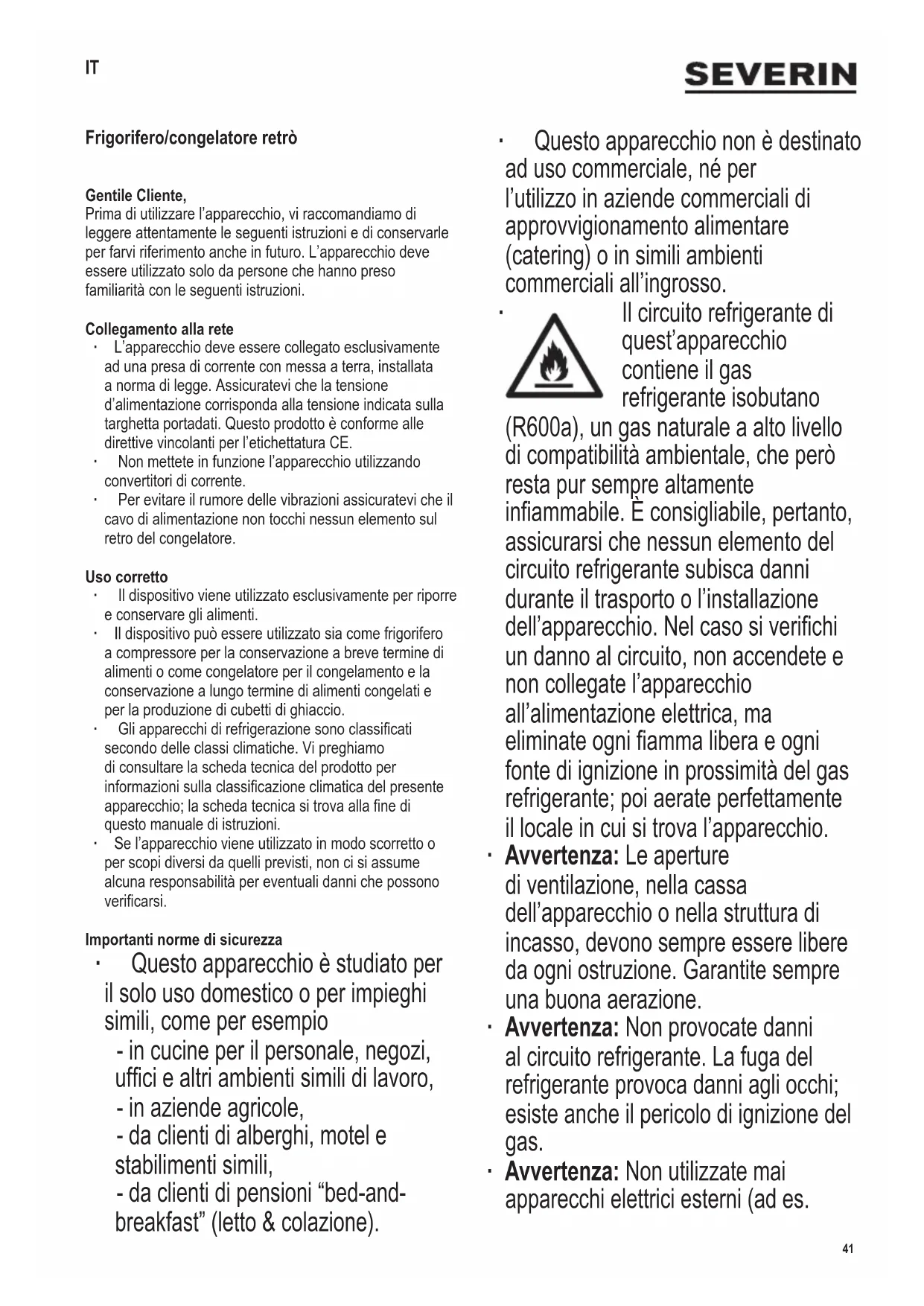 Il circuito refrigerante di quest’apparecchio contiene il gas refrigerante isobutano (R600a), un gas naturale a alto livello di compatibilità ambientale, che però resta pur sempre altamente inammabile. È consigliabile, pertanto, assicurarsi che nessun elemento del circuito refrigerante subisca danni durante il trasporto o l’installazione dell’apparecchio. Nel caso si verichi un danno al circuito, non accendete e non collegate l’apparecchio all’alimentazione elettrica, ma eliminate ogni amma libera e ogni fonte di ignizione in prossimità del gas refrigerante; poi aerate perfettamente il locale in cui si trova l’apparecchio. ∙ Avvertenza: Le aperture di ventilazione, nella cassa dell’apparecchio o nella struttura di incasso, devono sempre essere libere da ogni ostruzione. Garantite sempre una buona aerazione. ∙ Avvertenza: Non provocate danni al circuito refrigerante. La fuga del refrigerante provoca danni agli occhi; esiste anche il pericolo di ignizione del gas. ∙ Avvertenza: Non utilizzate mai apparecchi elettrici esterni (ad es.42 142 x 208 mm radiatori o termoventilatori) per accelerare il processo di sbrinamento; seguite sempre le modalità descritte nel presente manuale. ∙ Avvertenza: Non utilizzate nessun apparecchio elettrico (per esempio apparecchi per la preparazione di ghiaccio) all’interno del congelatore a meno che non siano specicatamente approvati nel presente manuale. ∙ Prima di collegare alla rete elettrica, controllate che l’apparecchio e il cavo di alimentazione non abbiano subito danni durante il trasporto. Nel caso siano rinvenuti eventuali danni, l’apparecchio non deve essere collegato all’alimentazione elettrica. ∙ Durante il processo di installazione, assicurarsi che il cavo di alimentazione non venga schiacciato dall’apparecchio o sia danneggiato. ∙ Le prese multiple portabili o gli alimentatori non devono essere posizionati sul retro del dispositivo. ∙ Questo apparecchio non è adatto alla conservazione di sostanze esplosive come per esempio bombolette aerosol con propellenti inammabili. ∙ In fase di vendita, conferimento o conferimento al riciclaggio, si deve fare riferimento al propellente ciclopentano (C