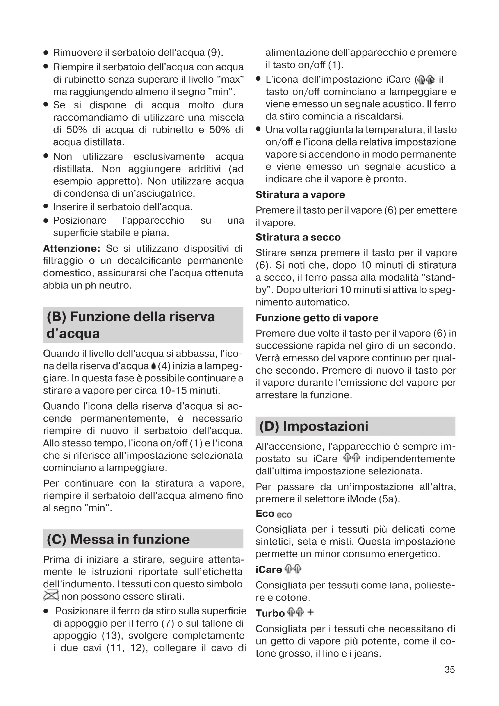 Posizionare l'apparecchio su una superficie stabile e piana. Attenzione: Se si utilizzano dispositivi di filtraggio o un decalcificante permanente domestico, assicurarsi che l'acqua ottenuta abbia un ph neutro. (B) Funzione della riserva d'acqua Quando il livello dell'acqua si abbassa, l'ico- na della riserva d'acqua (4) inizia a lampeg- giare. In questa fase è possibile continuare a stirare a vapore per circa 10-15 minuti. Quando l'icona della riserva d'acqua si ac- cende permanentemente, è necessario riempire di nuovo il serbatoio dell'acqua. Allo stesso tempo, l'icona on/o (1) e l’icona che si riferisce all’impostazione selezionata cominciano a lampeggiare. Per continuare con la stiratura a vapore, riempire il serbatoio dell'acqua almeno fino al segno "min". (C) Messa in funzione Prima di iniziare a stirare, seguire attenta- mente le istruzioni riportate sull’etichetta dell’indumento. I tessuti con questo simbolo non possono essere stirati.