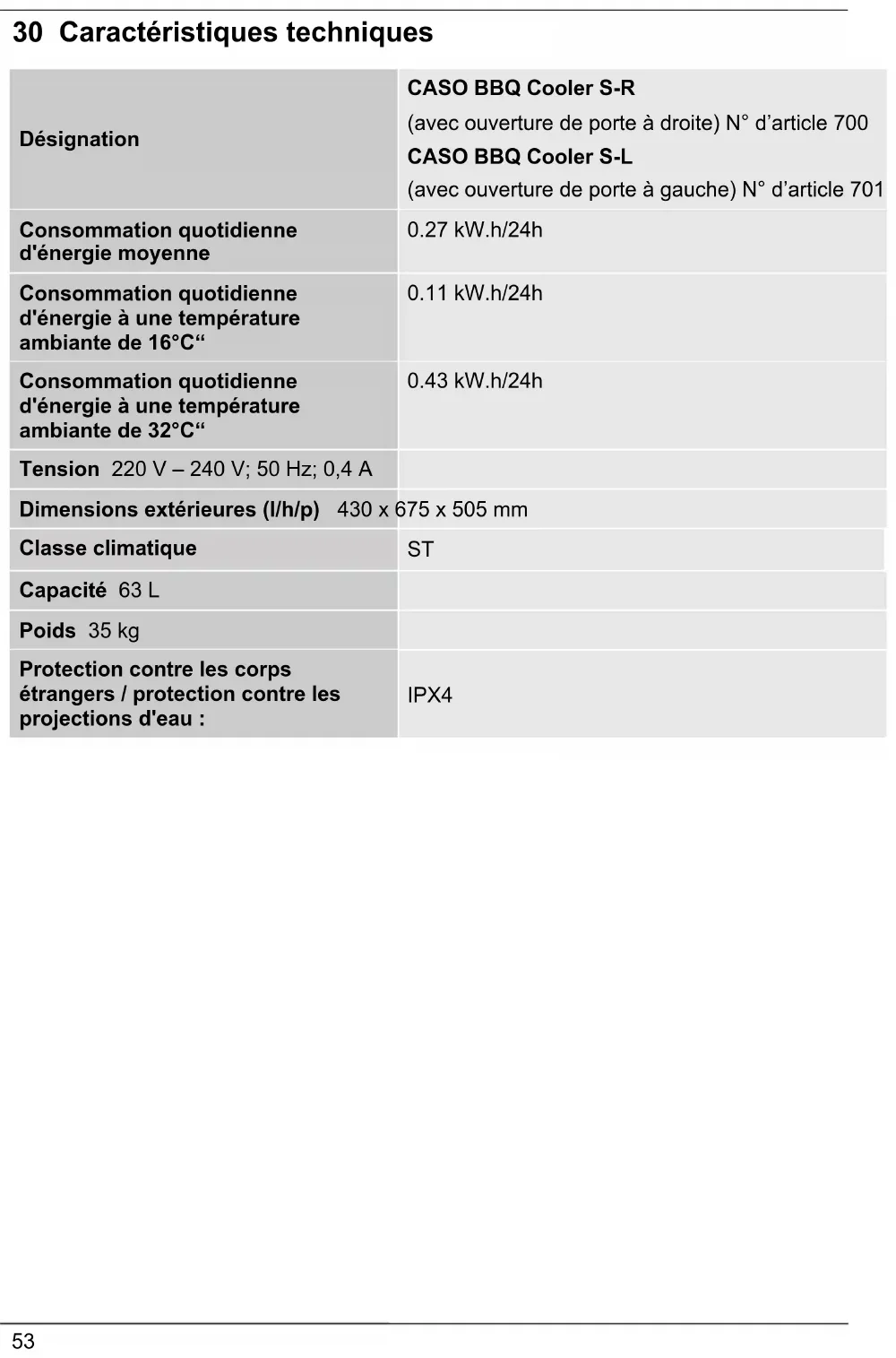 Capacité 63 L Poids 35 kg Protection contre les corps étrangers / protection contre les projections d'eau : IPX454 Istruzioni d’uso originali CASO BBQ Cooler S-R (con apertura a destra) Nr. articolo 700 CASO BBQ Cooler S-L (con apertura a sinistra) Nr. articolo 70155 31 Istruzioni d´uso: In generale Legga le informazioni qui contenute, affinché acquisti rapidamente familiarità con il suo apparecchio e affinché possa utilizzare appieno le sue funzioni. Il Suo l´apparecchio Le renderà un buon servizio per molti anni, se lo tratterà e lo curerà in modo adeguato. Ci auguriamo che il suo utilizzo Le procuri molta gioia.