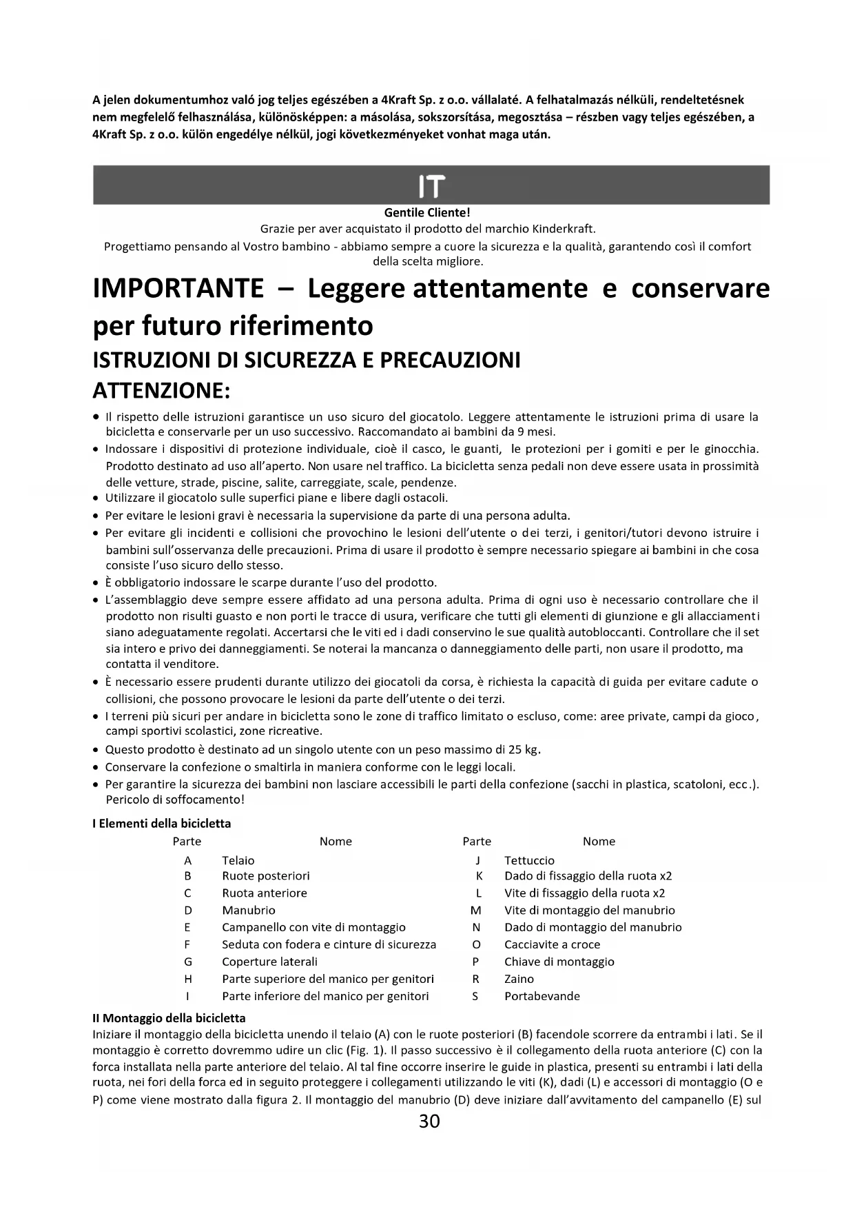 - Per garantire la sicurezza dei bambini non lasciare accessibili le parti della confezione (sacchi in plastica, scatoloni, ecc .). Pericolo di soffocamento! I Elementi della bicicletta Parte Nome Parte Nome