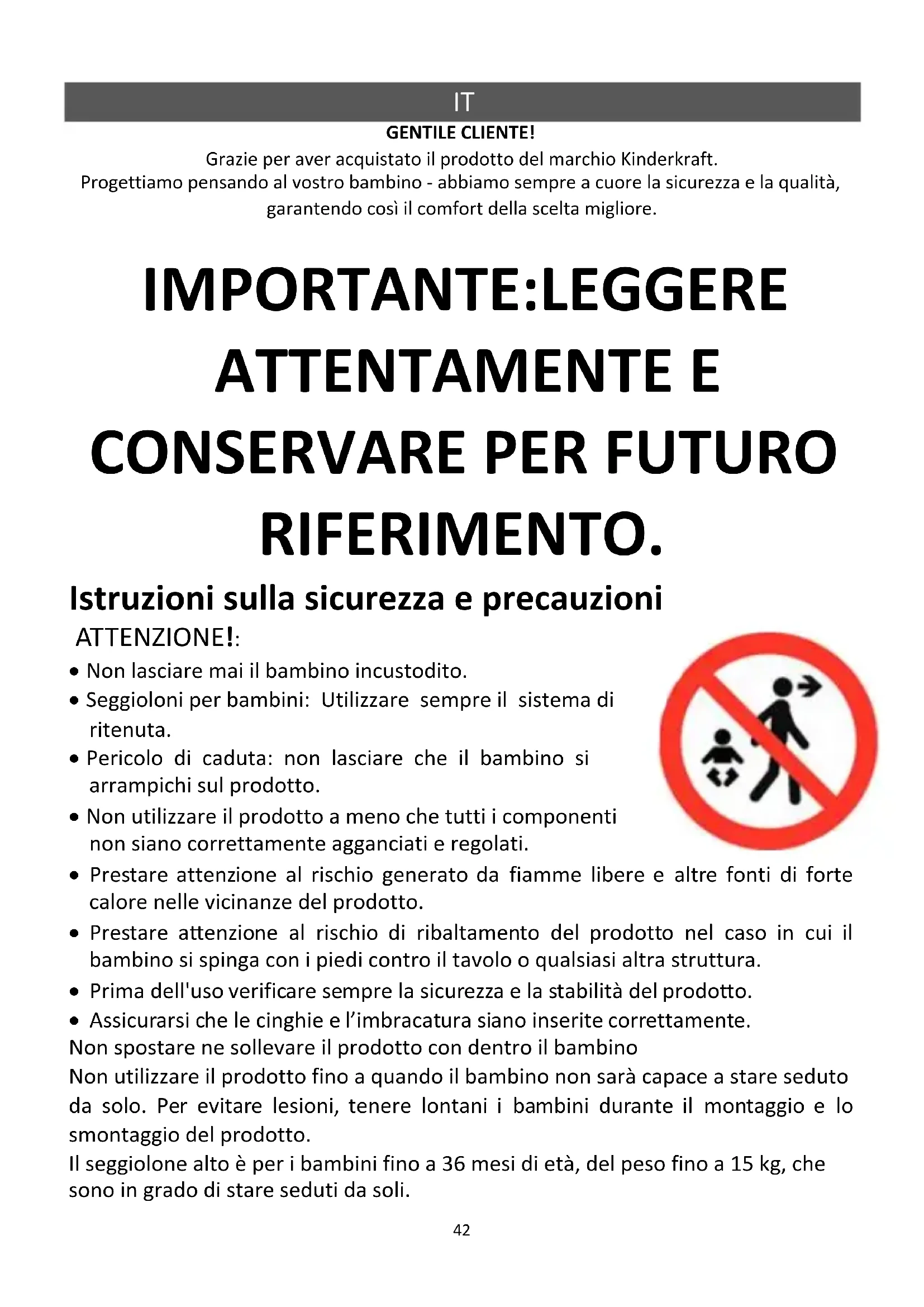 GENTILE CLIENTE! Grazie per aver acquistato il prodotto del marchio Kinderkraft. Progettiamo pensando al vostro bambino - abbiamo sempre a cuore la sicurezza e la qualità, garantendo così il comfort della scelta migliore. IMPORTANTE:LEGGERE ATTENTAMENTE E