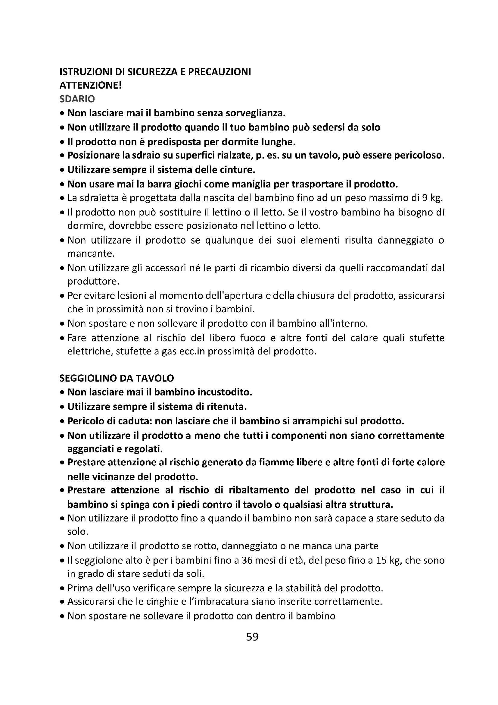 - Prestare attenzione al rischio di ribaltamento del prodotto nel caso in cui il bambino si spinga con i piedi contro il tavolo o qualsiasi altra struttura.