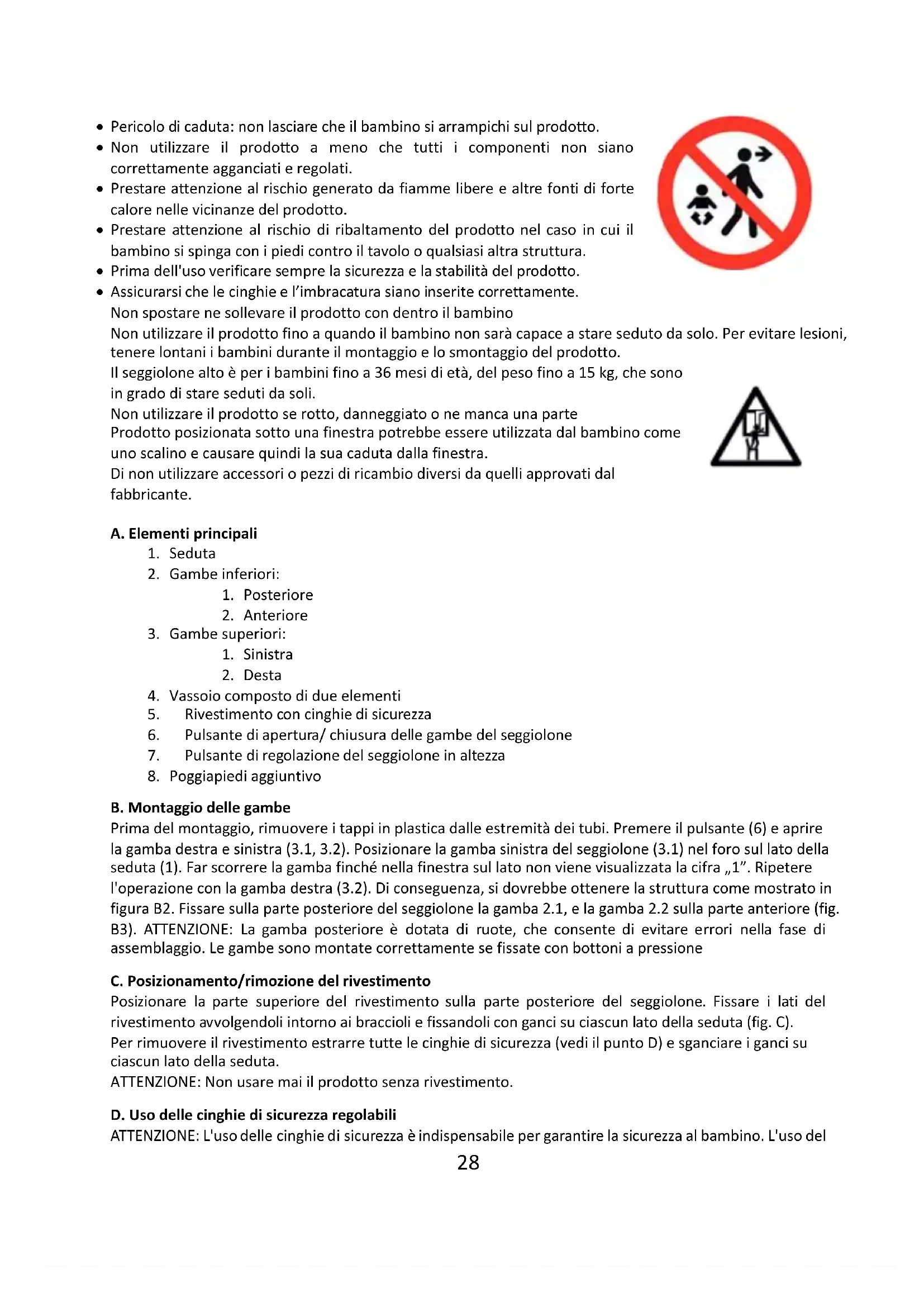 - Assicurarsi che le cinghie e l’imbracatura siano inserite correttamente. Non spostare ne sollevare il prodotto con dentro il bambino Non utilizzare il prodotto fino a quando il bambino non sarà capace a stare seduto da solo. Per evitare lesioni, tenere lontani i bambini durante il montaggio e lo smontaggio del prodotto. Il seggiolone alto è per i bambini fino a 36 mesi di età, del peso fino a 15 kg, che sono in grado di stare seduti da soli. Non utilizzare il prodotto se rotto, danneggiato o ne manca una parte Prodotto posizionata sotto una finestra potrebbe essere utilizzata dal bambino come uno scalino e causare quindi la sua caduta dalla finestra. Di non utilizzare accessori o pezzi di ricambio diversi da quelli approvati dal fabbricante. A. Elementi principali