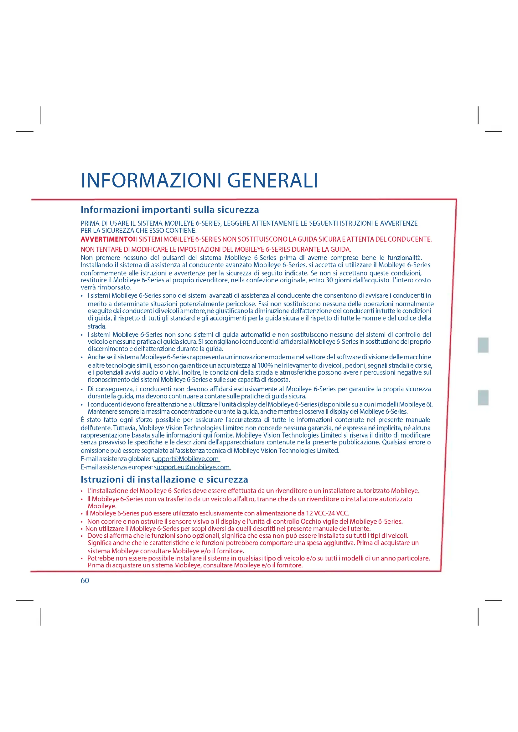- Licenza e garanzie INFORMAZIONI GENERALI Informazioni importanti sulla sicurezza PRIMA DI USARE IL SISTEMA MOBILEYE 6SERIES, LEGGERE ATTENTAMENTE LE SEGUENTI ISTRUZIONI E AVVERTENZE PER LA SICUREZZA CHE ESSO CONTIENE. AVVERTIMENTO! I SISTEMI MOBILEYE 6SERIES NON SOSTITUISCONO LA GUIDA SICURA E ATTENTA DEL CONDUCENTE. NON TENTARE DI MODIFICARE LE IMPOSTAZIONI DEL MOBILEYE 6SERIES DURANTE LA GUIDA.Non premere nessuno dei pulsanti del sistema Mobileye 6-Series prima di averne compreso bene le funzionalità. Installando il sistema di assistenza al conducente avanzato Mobileye 6-Series, si accetta di utilizzare il Mobileye 6-Series conformemente alle istruzioni e avvertenze per la sicurezza di seguito indicate. Se non si accettano queste condizioni, restituire il Mobileye 6-Series al proprio rivenditore, nella confezione originale, entro 30 giorni dall'acquisto. L'intero costo verrà rimborsato. p. 7660