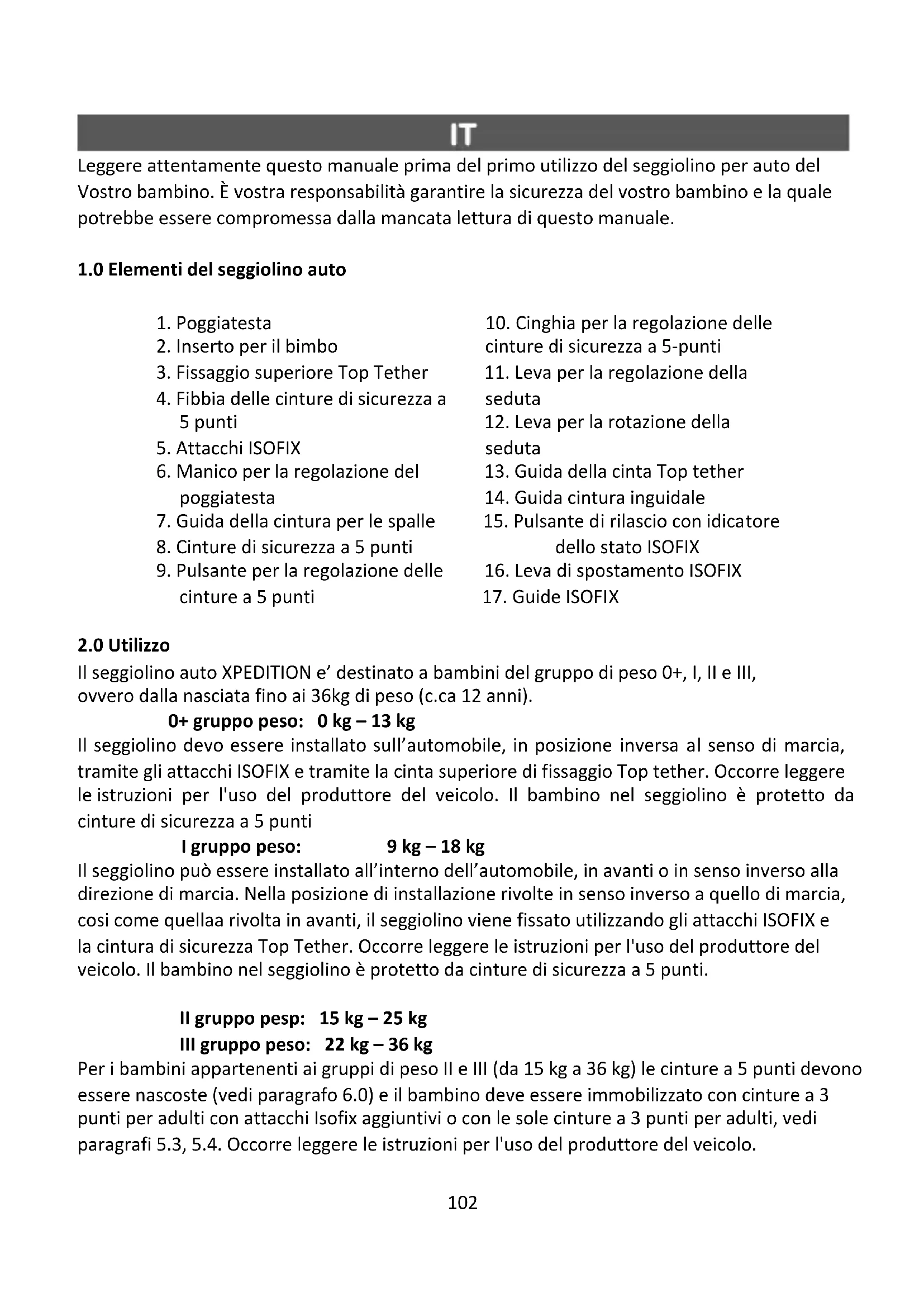 Il seggiolino auto XPEDITION e’ destinato a bambini del gruppo di peso 0+, I, II e III, ovvero dalla nasciata fino ai 36kg di peso (c.ca 12 anni). 0+ gruppo peso: 0 kg – 13 kg Il seggiolino devo essere installato sull’automobile, in posizione inversa al senso di marcia, tramite gli attacchi ISOFIX e tramite la cinta superiore di fissaggio Top tether. Occorre leggere le istruzioni per l'uso del produttore del veicolo. Il bambino nel seggiolino è protetto da cinture di sicurezza a 5 punti I gruppo peso: 9 kg – 18 kg Il seggiolino può essere installato all’interno dell’automobile, in avanti o in senso inverso alla direzione di marcia. Nella posizione di installazione rivolte in senso inverso a quello di marcia, cosi come quellaa rivolta in avanti, il seggiolino viene fissato utilizzando gli attacchi ISOFIX e la cintura di sicurezza Top Tether. Occorre leggere le istruzioni per l'uso del produttore del veicolo. Il bambino nel seggiolino è protetto da cinture di sicurezza a 5 punti. II gruppo pesp: 15 kg – 25 kg III gruppo peso: 22 kg – 36 kg Per i bambini appartenenti ai gruppi di peso II e III (da 15 kg a 36 kg) le cinture a 5 punti devono essere nascoste (vedi paragrafo 6.0) e il bambino deve essere immobilizzato con cinture a 3 punti per adulti con attacchi Isofix aggiuntivi o con le sole cinture a 3 punti per adulti, vedi paragrafi 5.3, 5.4. Occorre leggere le istruzioni per l'uso del produttore del veicolo.103