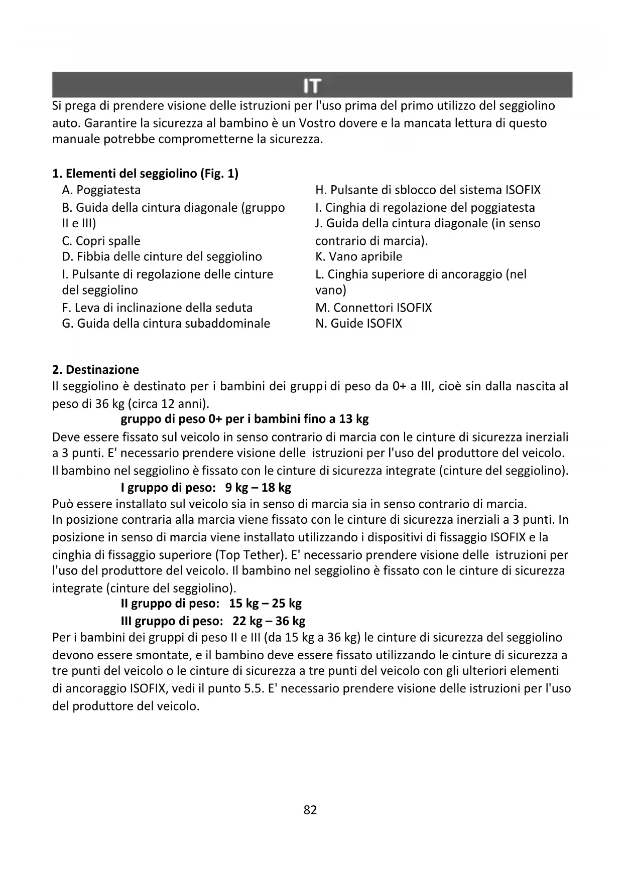Il seggiolino è destinato per i bambini dei gruppi di peso da 0+ a III, cioè sin dalla nascita al peso di 36 kg (circa 12 anni). gruppo di peso 0+ per i bambini fino a 13 kg Deve essere fissato sul veicolo in senso contrario di marcia con le cinture di sicurezza inerziali a 3 punti. E' necessario prendere visione delle istruzioni per l'uso del produttore del veicolo. Il bambino nel seggiolino è fissato con le cinture di sicurezza integrate (cinture del seggiolino). I gruppo di peso: 9 kg – 18 kg Può essere installato sul veicolo sia in senso di marcia sia in senso contrario di marcia. In posizione contraria alla marcia viene fissato con le cinture di sicurezza inerziali a 3 punti. In posizione in senso di marcia viene installato utilizzando i dispositivi di fissaggio ISOFIX e la cinghia di fissaggio superiore (Top Tether). E' necessario prendere visione delle istruzioni per l'uso del produttore del veicolo. Il bambino nel seggiolino è fissato con le cinture di sicurezza integrate (cinture del seggiolino). II gruppo di peso: 15 kg – 25 kg III gruppo di peso: 22 kg – 36 kg Per i bambini dei gruppi di peso II e III (da 15 kg a 36 kg) le cinture di sicurezza del seggiolino devono essere smontate, e il bambino deve essere fissato utilizzando le cinture di sicurezza a tre punti del veicolo o le cinture di sicurezza a tre punti del veicolo con gli ulteriori elementi di ancoraggio ISOFIX, vedi il punto 5.5. E' necessario prendere visione delle istruzioni per l'uso del produttore del veicolo.83