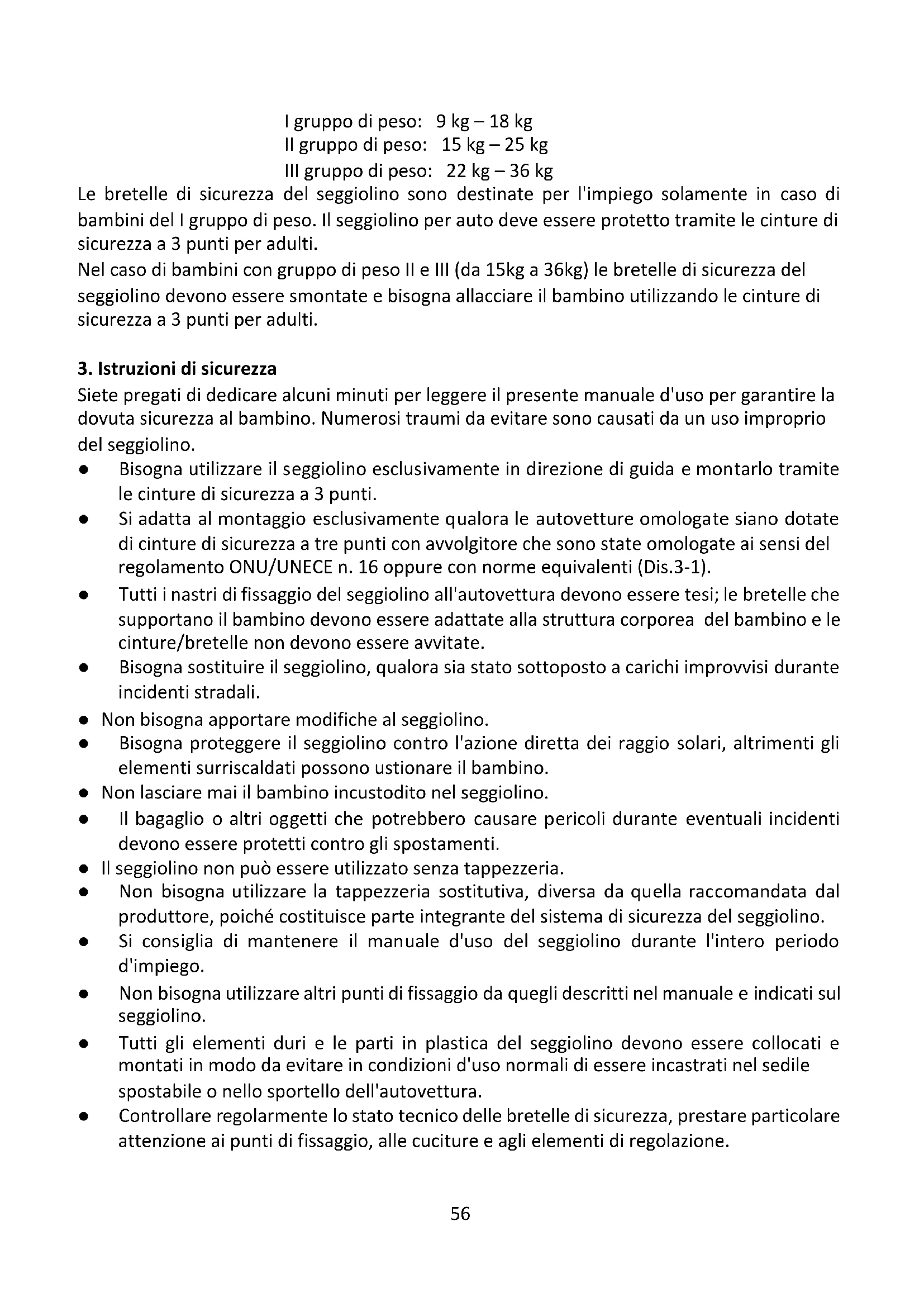 Siete pregati di dedicare alcuni minuti per leggere il presente manuale d'uso per garantire la dovuta sicurezza al bambino. Numerosi traumi da evitare sono causati da un uso improprio del seggiolino. ● Bisogna utilizzare il seggiolino esclusivamente in direzione di guida e montarlo tramite le cinture di sicurezza a 3 punti. ● Si adatta al montaggio esclusivamente qualora le autovetture omologate siano dotate di cinture di sicurezza a tre punti con avvolgitore che sono state omologate ai sensi del regolamento ONU/UNECE n. 16 oppure con norme equivalenti (Dis.3-1). ● Tutti i nastri di fissaggio del seggiolino all'autovettura devono essere tesi; le bretelle che supportano il bambino devono essere adattate alla struttura corporea del bambino e le cinture/bretelle non devono essere avvitate. ● Bisogna sostituire il seggiolino, qualora sia stato sottoposto a carichi improvvisi durante incidenti stradali. ● Non bisogna apportare modifiche al seggiolino. ● Bisogna proteggere il seggiolino contro l'azione diretta dei raggio solari, altrimenti gli elementi surriscaldati possono ustionare il bambino. ● Non lasciare mai il bambino incustodito nel seggiolino. ● Il bagaglio o altri oggetti che potrebbero causare pericoli durante eventuali incidenti devono essere protetti contro gli spostamenti. ● Il seggiolino non può essere utilizzato senza tappezzeria. ● Non bisogna utilizzare la tappezzeria sostitutiva, diversa da quella raccomandata dal produttore, poiché costituisce parte integrante del sistema di sicurezza del seggiolino. ● Si consiglia di mantenere il manuale d'uso del seggiolino durante l'intero periodo d'impiego. ● Non bisogna utilizzare altri punti di fissaggio da quegli descritti nel manuale e indicati sul seggiolino. ● Tutti gli elementi duri e le parti in plastica del seggiolino devono essere collocati e montati in modo da evitare in condizioni d'uso normali di essere incastrati nel sedile spostabile o nello sportello dell'autovettura. ● Controllare regolarmente lo stato tecnico delle bretelle di sicurezza, prestare particolare attenzione ai punti di fissaggio, alle cuciture e agli elementi di regolazione.57 ● Sospendere l'impiego del seggiolino qualora le sue parti siano state danneggiate o allentate dopo un incidente. ● In caso di situazione di emergenza bisogna slacciare immediatamente le cinture di sicurezza. Tale fatto indica che il pulsante di rilascio delle bretelle non è completamente protetto, assicurarsi che il bambino sappia che è vietato giocare con la fibbia. ● Prima di ogni impiego assicurarsi se tutte le parti siano fissate e che nessuna non impedisca lo scorrimento dei sedili e la chiusura dello sportello. ● Non utilizzare il seggiolino in casa. Non è adattato all'utilizzo in casa e bisogna utilizzarlo esclusivamente durante il viaggio in autovettura. ● Si consiglia il montaggio del seggiolino esclusivamente sui sedili posteriori dell'autovettura. ● Prima di ogni viaggio con l'autovettura assicurarsi, che il seggiolino sia montato in modo corretto. ● La parte posteriore del seggiolino deve appoggiarsi sullo schienale del sedile dell'autovettura. In caso di bisogno, regolare l'altezza dell’appoggia testa del sedile dell'autovettura. ● La grappa della cintura di sicurezza per adulti non può trovarsi troppo vicino alla parte inferiore del poggia braccio del seggiolino. In caso di dubbi concernenti questo punto, contattati con il produttore del seggiolino (Dis.3-2). ● Quando durante il viaggio il seggiolino sia vuoto, bisogna sempre chiuderlo con la cintura di sicurezza per adulti.