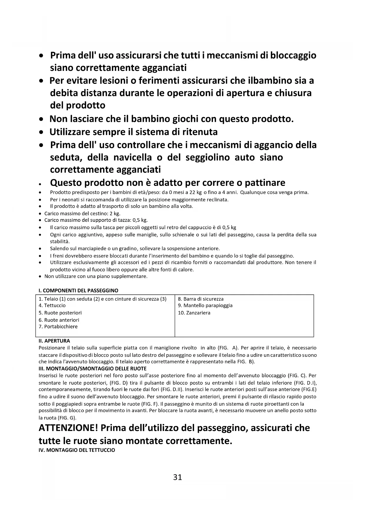 - Per evitare lesioni o ferimenti assicurarsi che ilbambino sia a debita distanza durante le operazioni di apertura e chiusura del prodotto
