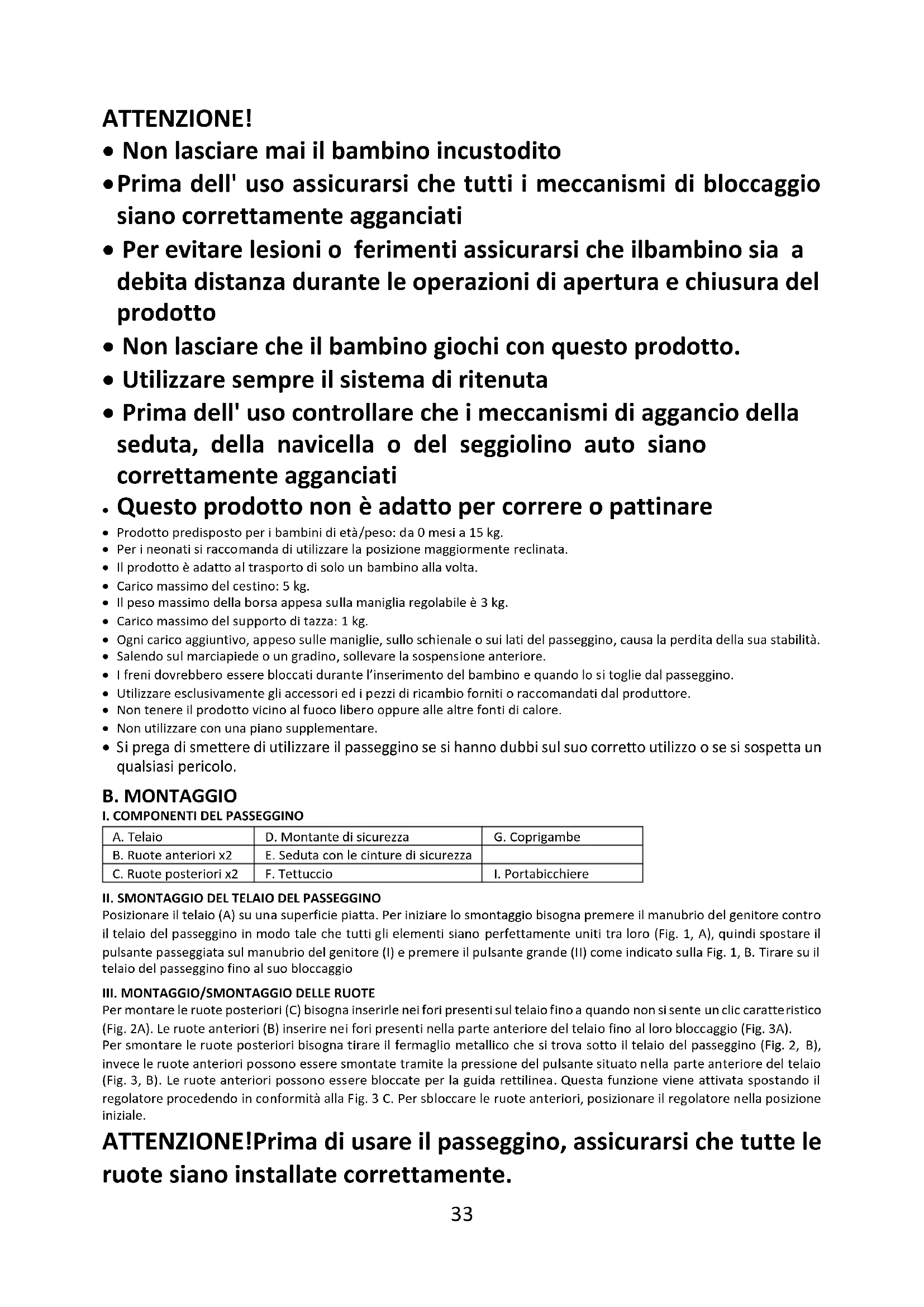 - Per evitare lesioni o ferimenti assicurarsi che ilbambino sia a debita distanza durante le operazioni di apertura e chiusura del prodotto