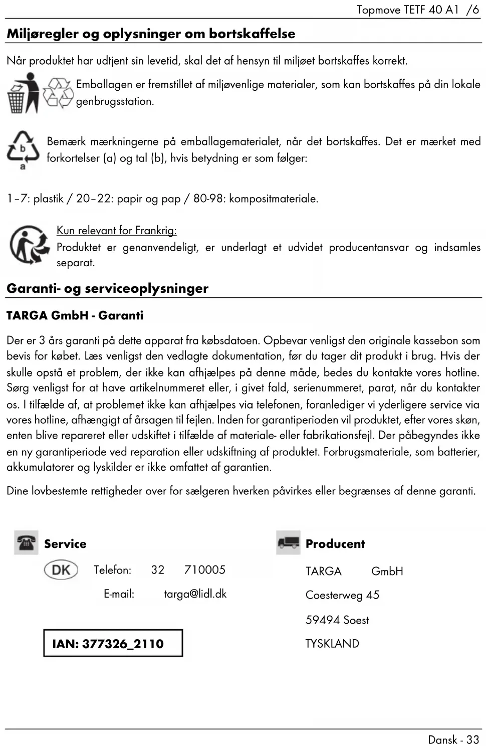 Normativa in materia ambientale e informazioni sullo smaltimento In caso di smaltimento, per salvaguardare l’ambiente smaltire il dispositivo in maniera adeguata. L’imballaggio è formato da materiali eco-compatibili, che possono essere riciclati nei centri di riciclaggio locali. In caso di smaltimento, prestare attenzione ai simboli sull'imballaggio, contrassegnato con abbreviazioni (a) e numeri (b), i cui significati sono i seguenti: 1–7: plastica / 20–22: carta e cartone / 80-98: materiale composito. Solo per la Francia: Il prodotto è riciclabile, è soggetto a responsabilità estesa del produttore ed è smaltito separatamente. Informazioni sull'assistenza e garanzia Garanzia di TARGA GmbH Con questo apparecchio riceve 3 anni di garanzia a partire dalla data di acquisto. Si prega di conservare lo scontrino fiscale originale come prova d'acquisto. Prima della messa in funzione del prodotto, leggere la documentazione allegata. Se dovesse presentarsi un problema che non si riesce a risolvere con i mezzi indicati, contattare la nostra assistenza clienti. Per ogni richiesta si prega di avere a disposizione il codice articolo o il numero di serie, se esistente. Nel caso in cui non sia possibile trovare una soluzione per via telefonica, tramite la nostra assistenza clienti viene contattata una seconda assistenza, in base alla causa del difetto. Grazie alla garanzia, se dovessero essere riscontrati difetti di materiale o di fabbricazione, il prodotto sarà, a nostra discrezione, riparato o sostituito gratuitamente. La riparazione o sostituzione del prodotto non comporta l’inizio di un nuovo periodo di garanzia. Materiali soggetti a usura come batterie, accumulatori ed elementi illuminanti sono esclusi dalla garanzia. I suoi diritti legali nei confronti del venditore non sono in alcun modo limitati da questa garanzia.
