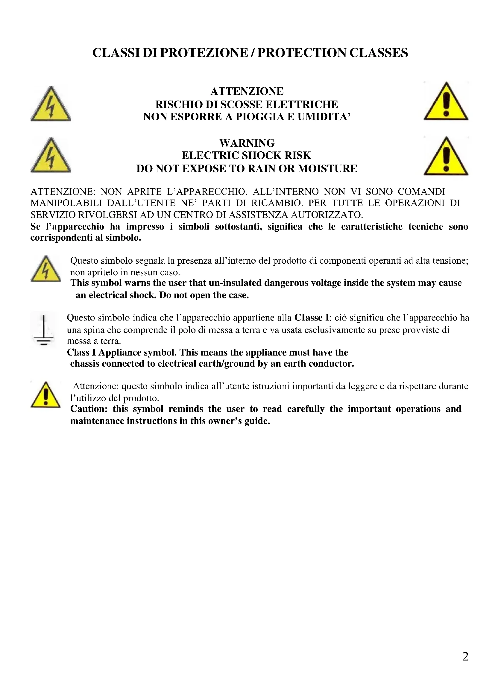 DO NOT EXPOSE TO RAIN OR MOISTURE ATTENZIONE: NON APRITE L’APPARECCHIO. ALL’INTERNO NON VI SONO COMANDI MANIPOLABILI DALL’UTENTE NE’ PARTI DI RICAMBIO. PER TUTTE LE OPERAZIONI DI SERVIZIO RIVOLGERSI AD UN CENTRO DI ASSISTENZA AUTORIZZATO. Se l’apparecchio ha impresso i simboli sottostanti, significa che le caratteristiche tecniche sono corrispondenti al simbolo. Questo simbolo segnala la presenza all’interno del prodotto di componenti operanti ad alta tensione; non apritelo in nessun caso. This symbol warns the user that un-insulated dangerous voltage inside the system may cause an electrical shock. Do not open the case. Questo simbolo indica che l’apparecchio appartiene alla CIasse I: ciò significa che l’apparecchio ha una spina che comprende il polo di messa a terra e va usata esclusivamente su prese provviste di messa a terra. Class I Appliance symbol. This means the appliance must have the chassis connected to electrical earth/ground by an earth conductor. Attenzione: questo simbolo indica all’utente istruzioni importanti da leggere e da rispettare durante l’utilizzo del prodotto. Caution: this symbol reminds the user to read carefully the important operations and maintenance instructions in this owner’s guide.3