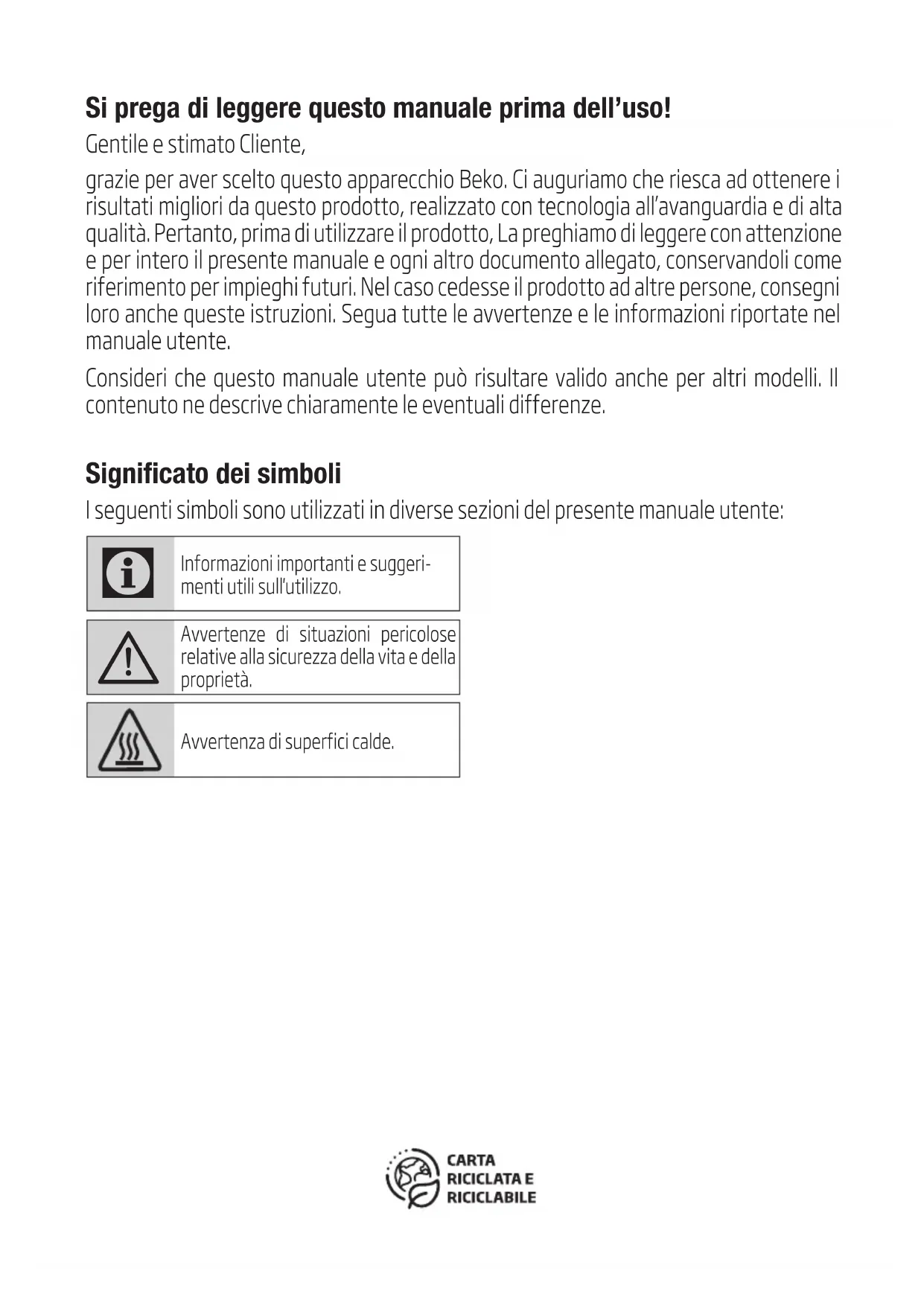 - Toute chute de l’appareil peut le rendre non opérationnel ou l’endommager de façon perma- nente.Si prega di leggere questo manuale prima dell’uso! Gentile e stimato Cliente, grazie per aver scelto questo apparecchio Beko. Ci auguriamo che riesca ad ottenere i risultati migliori da questo prodotto, realizzato con tecnologia all’avanguardia e di alta qualità. Pertanto, prima di utilizzare il prodotto, La preghiamo di leggere con attenzione e per intero il presente manuale e ogni altro documento allegato, conservandoli come riferimento per impieghi futuri. Nel caso cedesse il prodotto ad altre persone, consegni loro anche queste istruzioni. Segua tutte le avvertenze e le informazioni riportate nel manuale utente. Consideri che questo manuale utente può risultare valido anche per altri modelli. Il contenuto ne descrive chiaramente le eventuali differenze. Significato dei simboli I seguenti simboli sono utilizzati in diverse sezioni del presente manuale utente:
