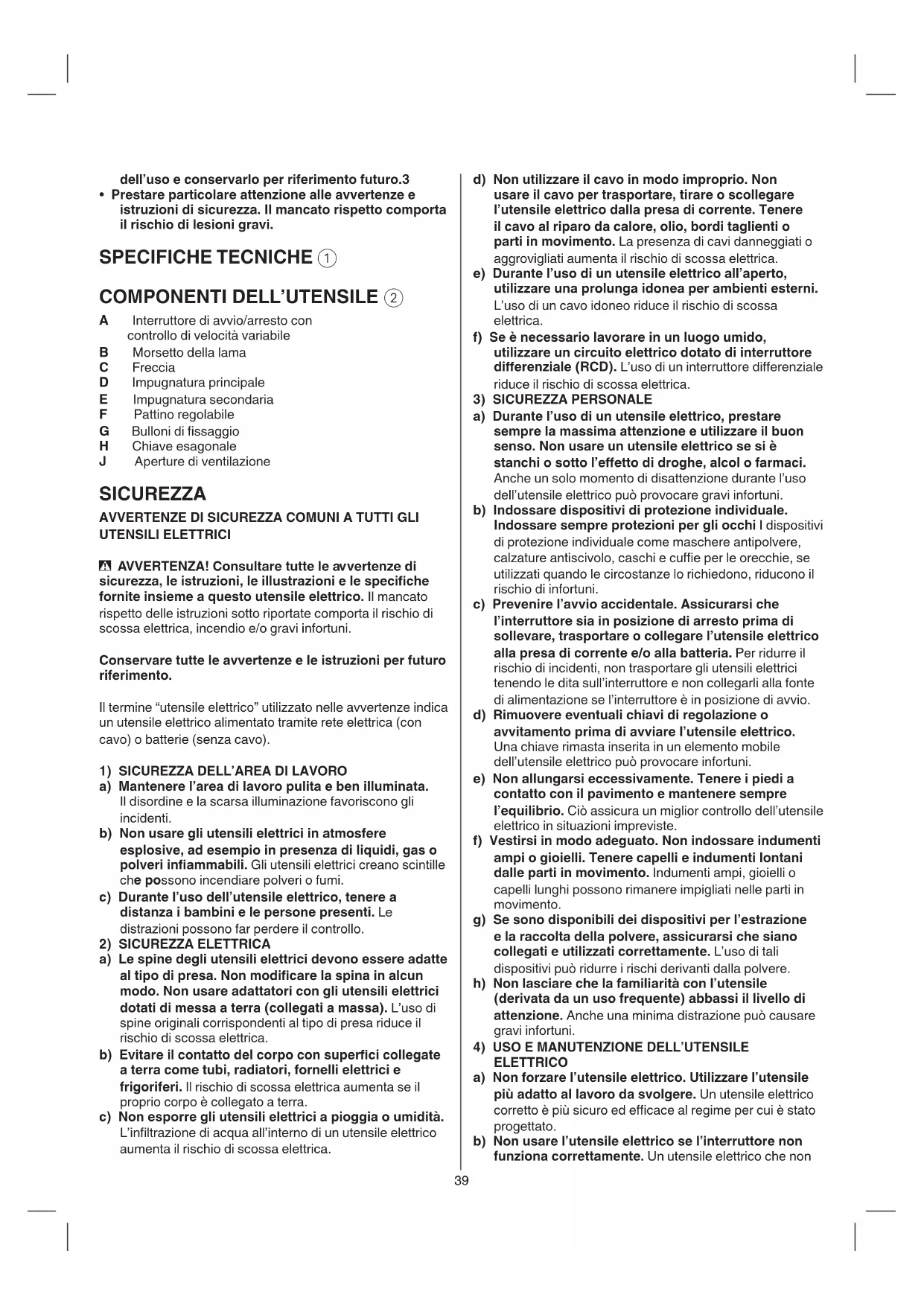 A Interruttore di avvio/arresto con controllo di velocità variabile B Morsetto della lama C Freccia D Impugnatura principale E Impugnatura secondaria F Pattino regolabile G Bulloni di ssaggio H Chiave esagonale J Aperture di ventilazione SICUREZZA AVVERTENZE DI SICUREZZA COMUNI A TUTTI GLI UTENSILI ELETTRICI - AVVERTENZA! Consultare tutte le avvertenze di sicurezza,leistruzioni,leillustrazionielespeciche fornite insieme a questo utensile elettrico. Il mancato rispetto delle istruzioni sotto riportate comporta il rischio di scossa elettrica, incendio e/o gravi infortuni. Conservare tutte le avvertenze e le istruzioni per futuro riferimento. Il termine “utensile elettrico” utilizzato nelle avvertenze indica un utensile elettrico alimentato tramite rete elettrica (con cavo) o batterie (senza cavo).