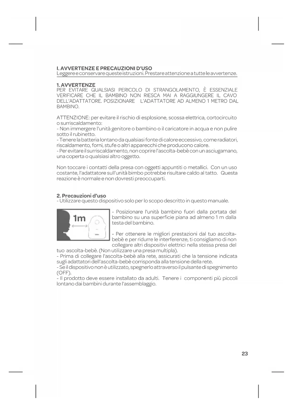 PER EVITARE QUALSIASI PERICOLO DI STRANGOLAMENTO, È ESSENZIALE VERIFICARE CHE IL BAMBINO NON RIESCA MAI A RAGGIUNGERE IL CAVO DELL’ADATTATORE. POSIZIONARE L’ADATTATORE AD ALMENO 1 METRO DAL BAMBINO. ATTENZIONE: per evitare il rischio di esplosione, scossa elettrica, cortocircuito o surriscaldamento: - Non immergere l’unità genitore o bambino o il caricatore in acqua e non pulire sotto il rubinetto. - Tenere la batteria lontano da qualsiasi fonte di calore eccessivo, come radiatori, riscaldamento, forni, stufe o altri apparecchi che producono calore. - Per evitare il surriscaldamento, non coprire l’ascolta-bebè con un asciugamano, una coperta o qualsiasi altro oggetto. Non toccare i contatti della presa con oggetti appuntiti o metallici. Con un uso costante, l’adattatore sull’unità bimbo potrebbe risultare caldo al tatto. Questa reazione è normale e non dovresti preoccuparti.