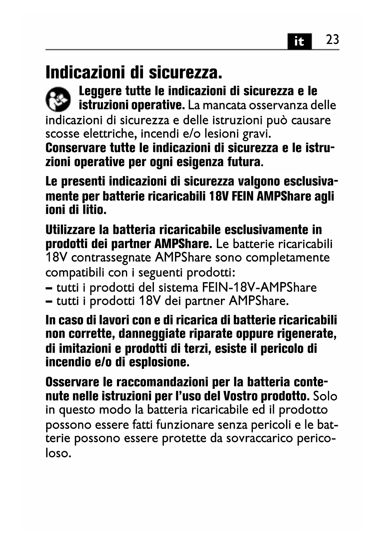 Indicazioni di sicurezza. Leggere tutte le indicazioni di sicurezza e le istruzioni operative. La mancata osservanza delle indicazioni di sicurezza e delle istruzioni può causare scosse elettriche, incendi e/o lesioni gravi. Conservare tutte le indicazioni di sicurezza e le istru- zioni operative per ogni esigenza futura. Le presenti indicazioni di sicurezza valgono esclusiva- mente per batterie ricaricabili 18V FEIN AMPShare agli ioni di litio. Utilizzare la batteria ricaricabile esclusivamente in prodotti dei partner AMPShare. Le batterie ricaricabili 18V contrassegnate AMPShare sono completamente compatibili con i seguenti prodotti: – tutti i prodotti del sistema FEIN-18V-AMPShare – tutti i prodotti 18V dei partner AMPShare. In caso di lavori con e di ricarica di batterie ricaricabili non corrette, danneggiate riparate oppure rigenerate, di imitazioni e prodotti di terzi, esiste il pericolo di incendio e/o di esplosione. Osservare le raccomandazioni per la batteria conte- nute nelle istruzioni per l’uso del Vostro prodotto. Solo in questo modo la batteria ricaricabile ed il prodotto possono essere fatti funzionare senza pericoli e le bat- terie possono essere protette da sovraccarico perico- loso.24