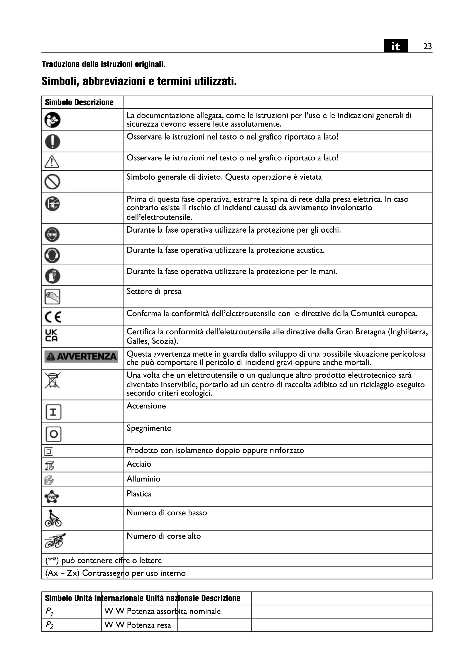 Traduzione delle istruzioni originali. Simboli, abbreviazioni e termini utilizzati. Simbolo Descrizione La documentazione allegata, come le istruzioni per l’uso e le indicazioni generali di sicurezza devono essere lette assolutamente. Osservare le istruzioni nel testo o nel grafico riportato a lato! Osservare le istruzioni nel testo o nel grafico riportato a lato! Simbolo generale di divieto. Questa operazione è vietata. Prima di questa fase operativa, estrarre la spina di rete dalla presa elettrica. In caso contrario esiste il rischio di incidenti causati da avviamento involontario dell’elettroutensile. Durante la fase operativa utilizzare la protezione per gli occhi. Durante la fase operativa utilizzare la protezione acustica. Durante la fase operativa utilizzare la protezione per le mani. Settore di presa Conferma la conformità dell’elettroutensile con le direttive della Comunità europea. Certifica la conformità dell'elettroutensile alle direttive della Gran Bretagna (Inghilterra, Galles, Scozia). Questa avvertenza mette in guardia dallo sviluppo di una possibile situazione pericolosa che può comportare il pericolo di incidenti gravi oppure anche mortali. Una volta che un elettroutensile o un qualunque altro prodotto elettrotecnico sarà diventato inservibile, portarlo ad un centro di raccolta adibito ad un riciclaggio eseguito secondo criteri ecologici. Accensione Spegnimento Prodotto con isolamento doppio oppure rinforzato Acciaio Alluminio Plastica Numero di corse basso Numero di corse alto (**) può contenere cifre o lettere (Ax – Zx) Contrassegno per uso interno Simbolo Unità internazionale Unità nazionale Descrizione