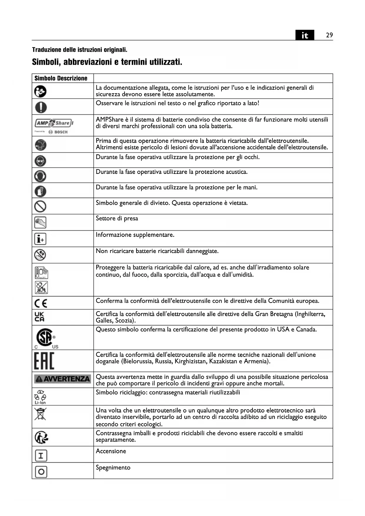 Traduzione delle istruzioni originali. Simboli, abbreviazioni e termini utilizzati. Simbolo Descrizione La documentazione allegata, come le istruzioni per l’uso e le indicazioni generali di sicurezza devono essere lette assolutamente. Osservare le istruzioni nel testo o nel grafico riportato a lato! AMPShare è il sistema di batterie condiviso che consente di far funzionare molti utensili di diversi marchi professionali con una sola batteria. Prima di questa operazione rimuovere la batteria ricaricabile dall’elettroutensile. Altrimenti esiste pericolo di lesioni dovute all’accensione accidentale dell’elettroutensile. Durante la fase operativa utilizzare la protezione per gli occhi. Durante la fase operativa utilizzare la protezione acustica. Durante la fase operativa utilizzare la protezione per le mani. Simbolo generale di divieto. Questa operazione è vietata. Settore di presa Informazione supplementare. Non ricaricare batterie ricaricabili danneggiate. Proteggere la batteria ricaricabile dal calore, ad es. anche dall'irradiamento solare continuo, dal fuoco, dalla sporcizia, dall'acqua e dall'umidità. Conferma la conformità dell’elettroutensile con le direttive della Comunità europea. Certifica la conformità dell'elettroutensile alle direttive della Gran Bretagna (Inghilterra, Galles, Scozia). Questo simbolo conferma la certificazione del presente prodotto in USA e Canada. Certifica la conformità dell'elettroutensile alle norme tecniche nazionali dell'unione doganale (Bielorussia, Russia, Kirghizistan, Kazakistan e Armenia). Questa avvertenza mette in guardia dallo sviluppo di una possibile situazione pericolosa che può comportare il pericolo di incidenti gravi oppure anche mortali. Simbolo riciclaggio: contrassegna materiali riutilizzabili Una volta che un elettroutensile o un qualunque altro prodotto elettrotecnico sarà diventato inservibile, portarlo ad un centro di raccolta adibito ad un riciclaggio eseguito secondo criteri ecologici. Contrassegna imballi e prodotti riciclabili che devono essere raccolti e smaltiti separatamente. Accensione Spegnimento max.50°C30