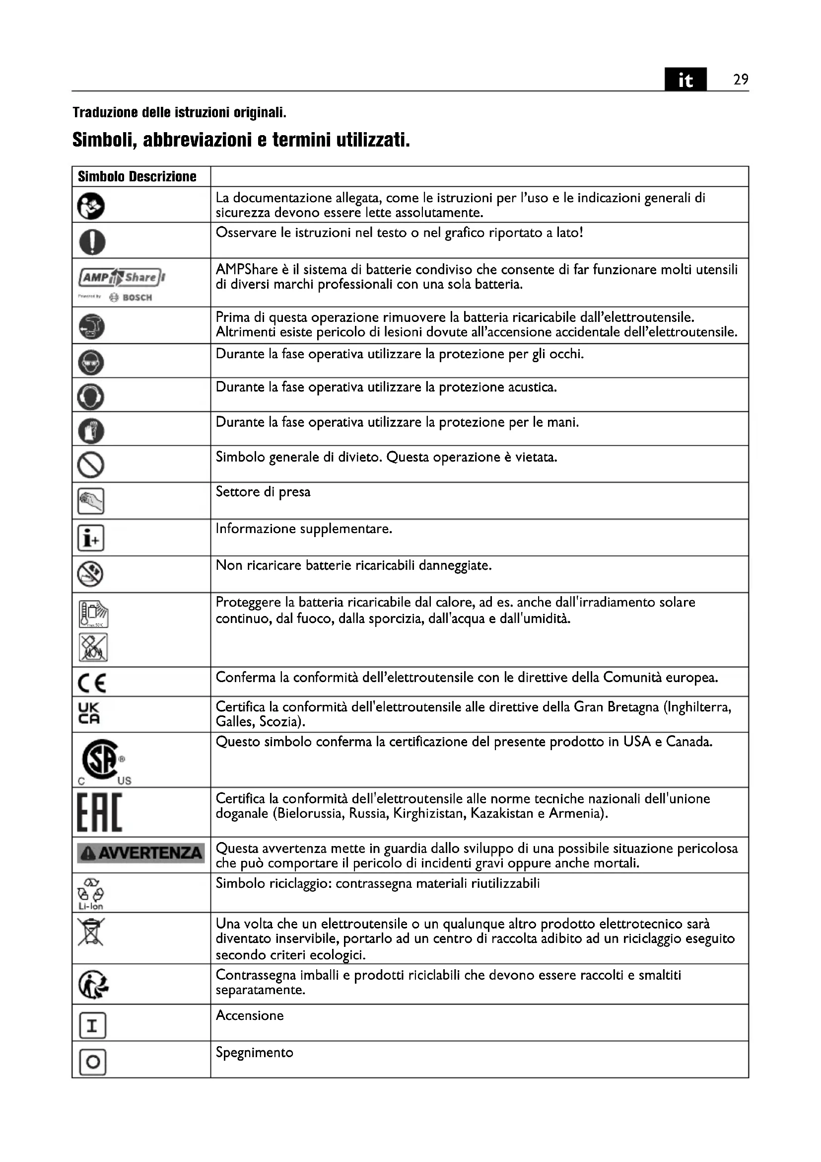 Traduzione delle istruzioni originali. Simboli, abbreviazioni e termini utilizzati. Simbolo Descrizione La documentazione allegata, come le istruzioni per l’uso e le indicazioni generali di sicurezza devono essere lette assolutamente. Osservare le istruzioni nel testo o nel grafico riportato a lato! AMPShare è il sistema di batterie condiviso che consente di far funzionare molti utensili di diversi marchi professionali con una sola batteria. Prima di questa operazione rimuovere la batteria ricaricabile dall’elettroutensile. Altrimenti esiste pericolo di lesioni dovute all’accensione accidentale dell’elettroutensile. Durante la fase operativa utilizzare la protezione per gli occhi. Durante la fase operativa utilizzare la protezione acustica. Durante la fase operativa utilizzare la protezione per le mani. Simbolo generale di divieto. Questa operazione è vietata. Settore di presa Informazione supplementare. Non ricaricare batterie ricaricabili danneggiate. Proteggere la batteria ricaricabile dal calore, ad es. anche dall'irradiamento solare continuo, dal fuoco, dalla sporcizia, dall'acqua e dall'umidità. Conferma la conformità dell’elettroutensile con le direttive della Comunità europea. Certifica la conformità dell'elettroutensile alle direttive della Gran Bretagna (Inghilterra, Galles, Scozia). Questo simbolo conferma la certificazione del presente prodotto in USA e Canada. Certifica la conformità dell'elettroutensile alle norme tecniche nazionali dell'unione doganale (Bielorussia, Russia, Kirghizistan, Kazakistan e Armenia). Questa avvertenza mette in guardia dallo sviluppo di una possibile situazione pericolosa che può comportare il pericolo di incidenti gravi oppure anche mortali. Simbolo riciclaggio: contrassegna materiali riutilizzabili Una volta che un elettroutensile o un qualunque altro prodotto elettrotecnico sarà diventato inservibile, portarlo ad un centro di raccolta adibito ad un riciclaggio eseguito secondo criteri ecologici. Contrassegna imballi e prodotti riciclabili che devono essere raccolti e smaltiti separatamente. Accensione Spegnimento max.50°C30