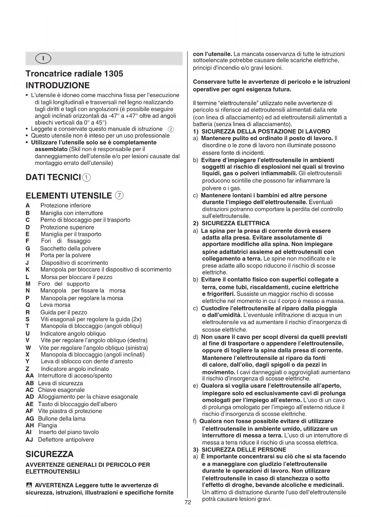 A Protezione inferiore B Maniglia con interruttore C Perno di bloccaggio per il trasporto D Protezione superiore E Maniglia per il trasporto F Fori di ssaggio G Sacchetto della polvere H Porta per la polvere J Dispositivo di scorrimento K Manopola per bloccare il dispositivo di scorrimento L Morsa per bloccare il pezzo M Foro del supporto N Manopola per ssare la morsa P Manopola per regolare la morsa Q Leva morsa R Guida per il pezzo S Viti esagonali per regolare la guida (2x) T Manopola di bloccaggio (angoli obliqui) U Indicatore angolo obliquo V Vite per regolare l’angolo obliquo (destra) W Vite per regolare l’angolo obliquo (sinistra) X Manopola di bloccaggio (angoli inclinati) Y Leva di sblocco con dente d’arresto Z Indicatore angolo inclinato AA Interruttore di acceso/spento AB Leva di sicurezza AC Chiave esagonale AD Alloggiamento per la chiave esagonale AE Tasto di bloccaggio dell’albero AF Vite piastra di protezione AG Bullone della lama AH Flangia AI Inserto del piano tavolo AJ Deettore antipolvere SICUREZZA