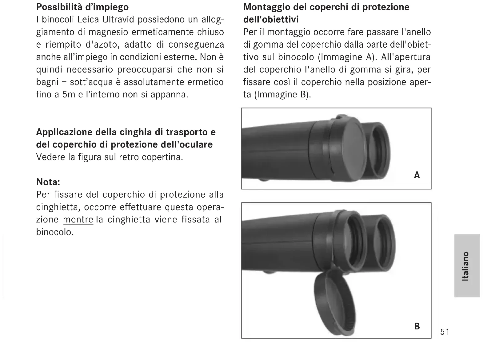 Non osservare mai con il binocolo mentre si cammina. Ciò potrebbe impedire la visione degli ostacoli.Italiano Possibilità d’impiego I binocoli Leica Ultravid possiedono un allog- giamento di magnesio ermeticamente chiuso e riempito d'azoto, adatto di conseguenza anche all’impiego in condizioni esterne. Non è quindi necessario preoccuparsi che non si bagni – sott’acqua è assolutamente ermetico fino a 5m e l’interno non si appanna. Applicazione della cinghia di trasporto e del coperchio di protezione dell'oculare Vedere la figura sul retro copertina. Nota: Per fissare del coperchio di protezione alla cinghietta, occorre effettuare questa opera- zione mentr e la cinghietta viene fissata al binocolo. Montaggio dei coperchi di protezione dell'obiettivi Per il montaggio occorre fare passare l'anello di gomma del coperchio dalla parte dell'obiet- tivo sul binocolo (Immagine A). All'apertura del coperchio l'anello di gomma si gira, per fissare così il coperchio nella posizione aper- ta (Immagine B).