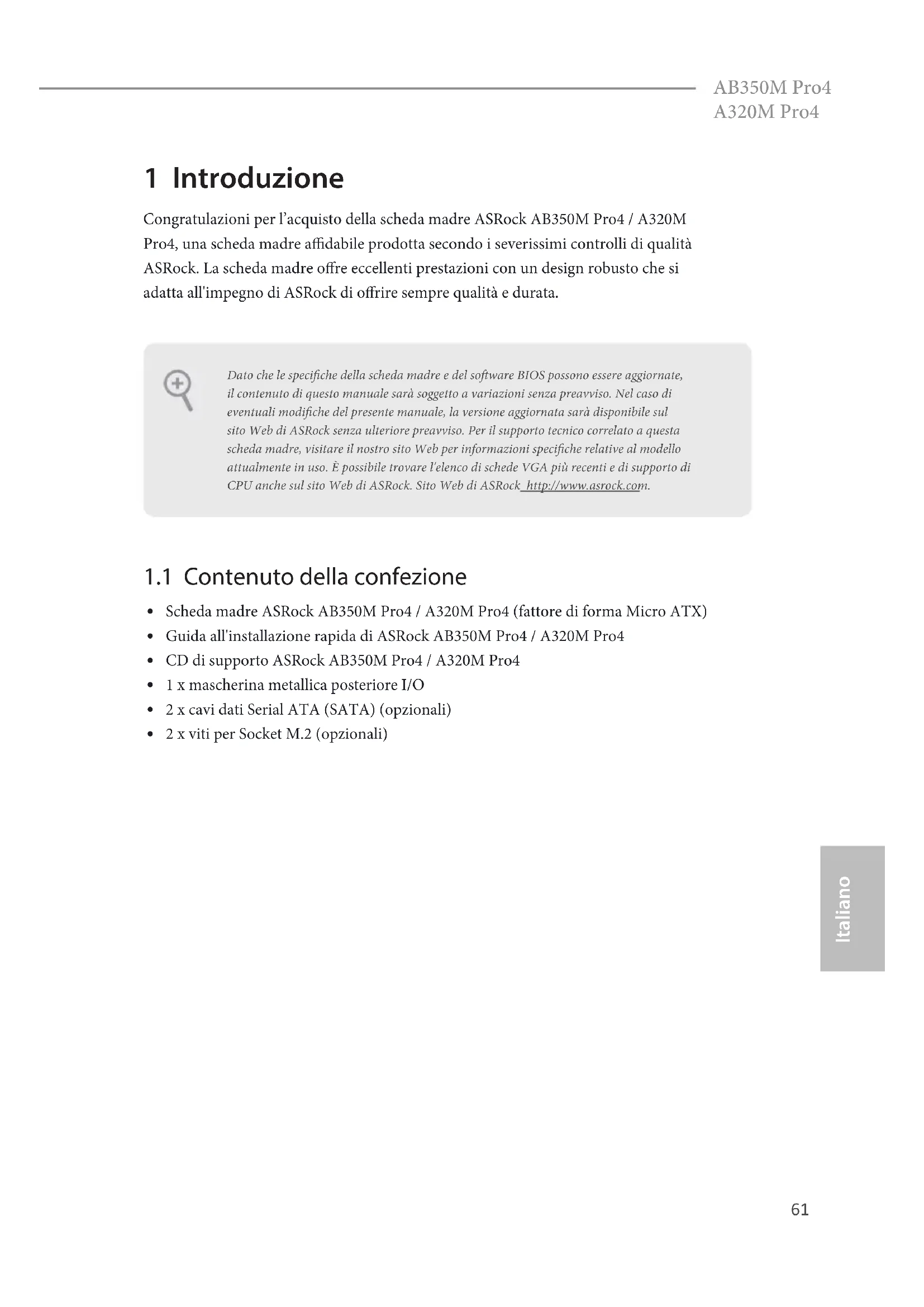 Italiano 1 Introduzione Congratulazioni per l’acquisto della scheda madre ASRock AB350M Pro4 / A320M Pro4, una scheda madre adabile prodotta secondo i severissimi controlli di qualità ASRock. La scheda madre ore eccellenti prestazioni con un design robusto che si adatta all'impegno di ASRock di orire sempre qualità e durata.